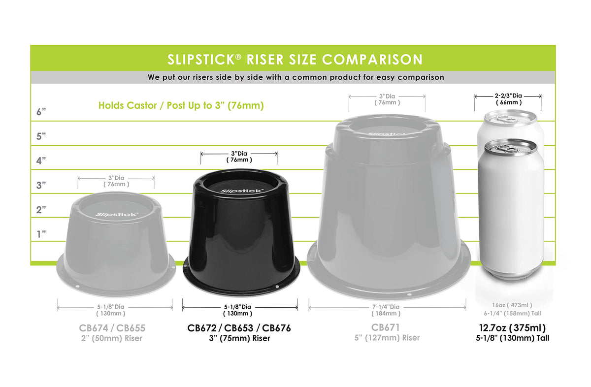 Slipstick Cb653 Set Of 6 Premium Furniture Risers Add 3 Inches Of Height To Beds / Furniture And Are Great Solution For Making Additional Storage Space. The Added Height Also Makes Cleaning Under Furniture Easier (Great For Robot Vacuums). Each Riser Features A Steel Reinforced Plate Under The Furniture Leg Holder / Caster Cup That Prevents Bed Posts, Bed Rollers, Caster Wheels, Or Furniture Legs From Puncturing Through. Risers Feature A 1-Inch Deep Recessed Holder Cup With Memory Foam Cushion Pad Built Into Top That Securely Locks In Caster Wheels, Bed Rollers / Posts, And Furniture Legs Up To 3 Inches Round Or 2-1/4 Inches Square At Foot. This Set Of 6 Risers Supports 3,960 Pounds (660 Pounds Per Riser Cup) And Each Riser Features 3 Small Rubber Grips On Base To Protect Floor And Prevent Furniture From Sliding. Covered By A 5-Year Free Replacement Warranty Should Any Product Fail Due To Premature Wear Or Defect (Commercial Warranty 1 Year).