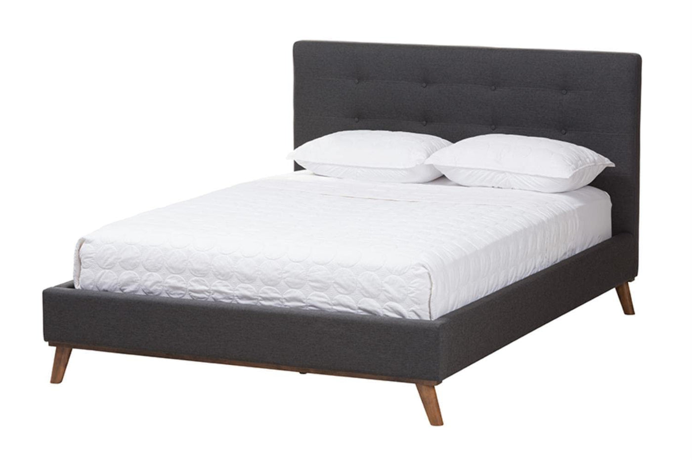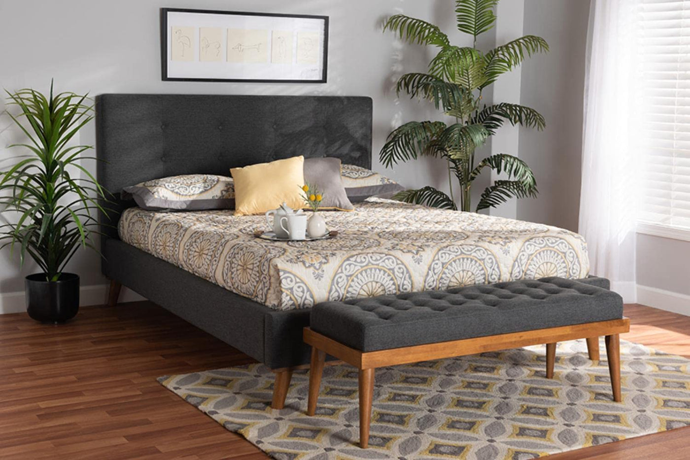 The timeless appeal of minimalist design in the Valencia bedroom set creates a delightful environment in any layout. Made in Malaysia, this lovely set includes one bed and one bench cushioned with foam and upholstered in soft fabric. Both the broad headboard and seat cushion of the bench feature exquisite button-tufted designs for a touch of traditional elegance. The Valencia set requires assembly and utilizes wood slats for mattress support, eliminating the need for a box spring. Offering a contemporary yet serene setting, the Valencia bedroom set is sure to elevate any space.FeaturesMid-century set includes one (1) queen size bed and one (1) benchConstructed from Rubberwood and Engineered WoodUpholstered in fabric and padded with foamButton-tufted embellishmentsTapered legsWood slats eliminate the need for a box springCare Instruction: Spot CleanStyle : Mid-CenturyIncludes: One (1) Queen Size Bed; One (1) BenchMaterial: Fabric, Polyester, Rubberwood, Plywood, MDF, LVL, Veneer, FoamColor: Dark Grey, Walnut BrownOverall Bed: 66.34" W x 87.40" D x 45.87" HOverall Headboard: 66.34" W x 4.33" D x 45.87" HMax Mattress Size Allowed: 61.00" W x 81.00" DHeight from floor to top of footboard: 14.75" HHeight from floor to top of slats: 13.63" HDistance between each slat: 3.50" WBed legs: 5.91" HOverall Bench: 47.20" W x 17.50" D x 17.50" HBench Legs: 10.60" H;Assembly Required: YesMade In MalaysiaWarning: This product can expose you to chemicals including Formaldehyde which is known to the State of California to cause cancer.