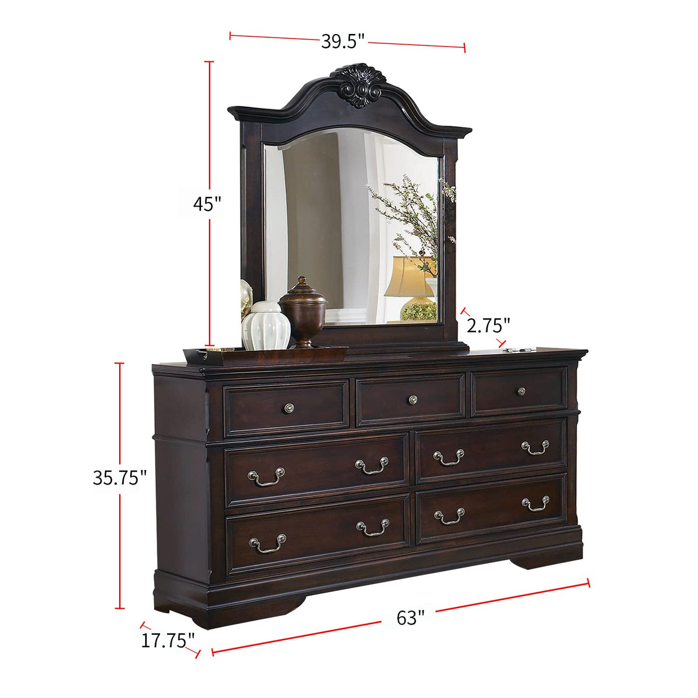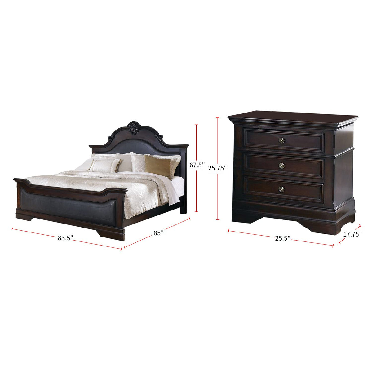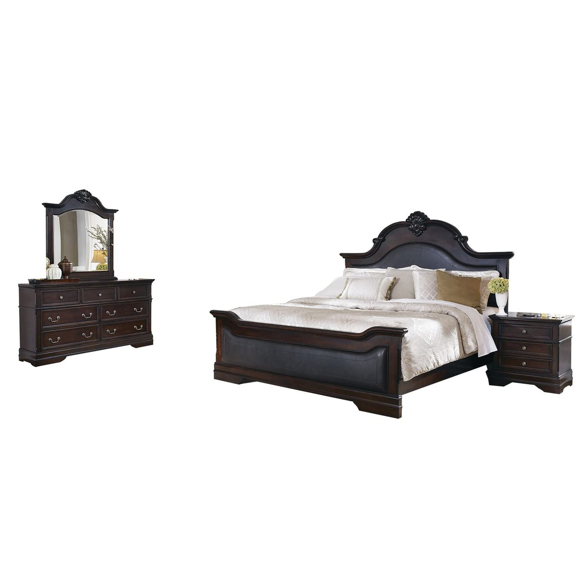 Bring classic comfort to your bedroom with this impressive four-piece set from the Cambridge Collection. Traditional profiles and ornate details lend these pieces timeless appeal, easily able to overcome changing trends for lasting enjoyment. The dark finish even makes for easier integration with a variety of décor styles and color palettes. This set includes a nightstand, dresser with mirror, and a spacious Eastern King bed with a plush upholstered headboard.