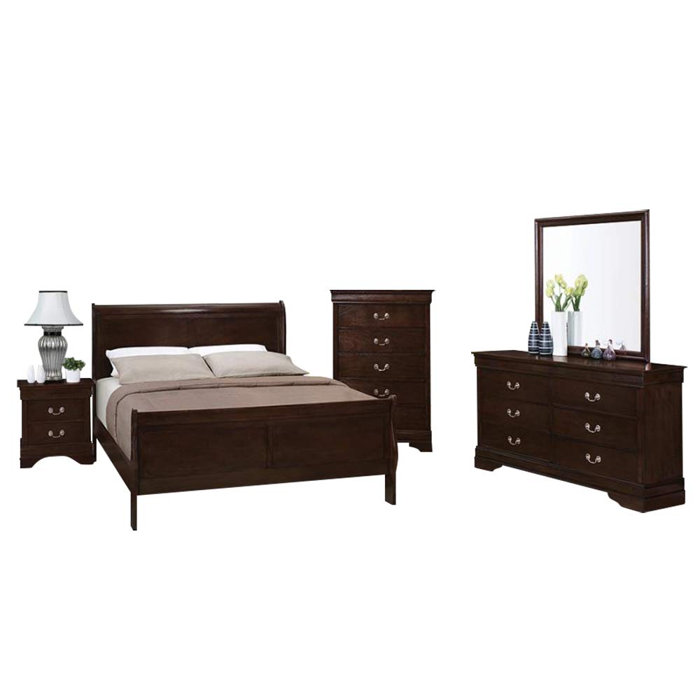 The Louis Philippe collection features this 5-piece bedroom set that is well-suited for a youth or guest bedroom. The Full bed (also available in Eastern King, Queen, and Twin) has a slightly flared headboard and footboard for added styling. The nightstand and chest have spacious drawers featuring dovetail construction and handy yet stylish silver bail handles. The dresser features drawers with similar construction and accents as well as enough space on top for the rectangular mirror with clean lines to complete the look. This traditional style set is crafted from select hardwoods and wood veneer and with a warm cappuccino finish for an elegant appeal.FeaturesA slightly higher headboard distinguishes this classic Louis Philippe style bed Nickel finish bail drawer handles decorate drawer fronts Dovetail drawer construction creates a sturdy drawer foundation Crafted from Asian hardwood and okoume veneer Headboard only options are available to use with metal bed framesDimensions:Bedroom SetAssembled Product: 56.25 inches wide x 84.5 inches deep x 47.25 inches high Weight Capacity: 600 poundsAt Coaster, we are your premier source for exquisite furniture, offering diverse styles to enhance every aspect of your life. Our passion for excellence drives us to innovate, crafting budget-friendly furniture that complements your lifestyle. Explore our brands for endless design inspiration and make your living experience exceptional with thoughtfully designed, affordable pieces that inspire a life well-lived.