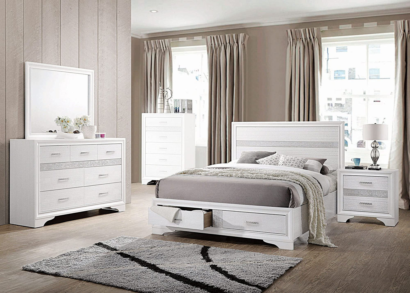 Help bring some light into your room with this contemporary design and elegant, timeless look with just the right amount of glittering panels. These bedroom 4 pieces offer exclusive rhinestone pull handles and a brilliant white finish to brighten up your room. Sturdy Asian hardwoods were used for construction, complemented by 3D paper foil veneer. An queen storage bed, along with a nightstand, dresser, and mirror, is included within the set.
