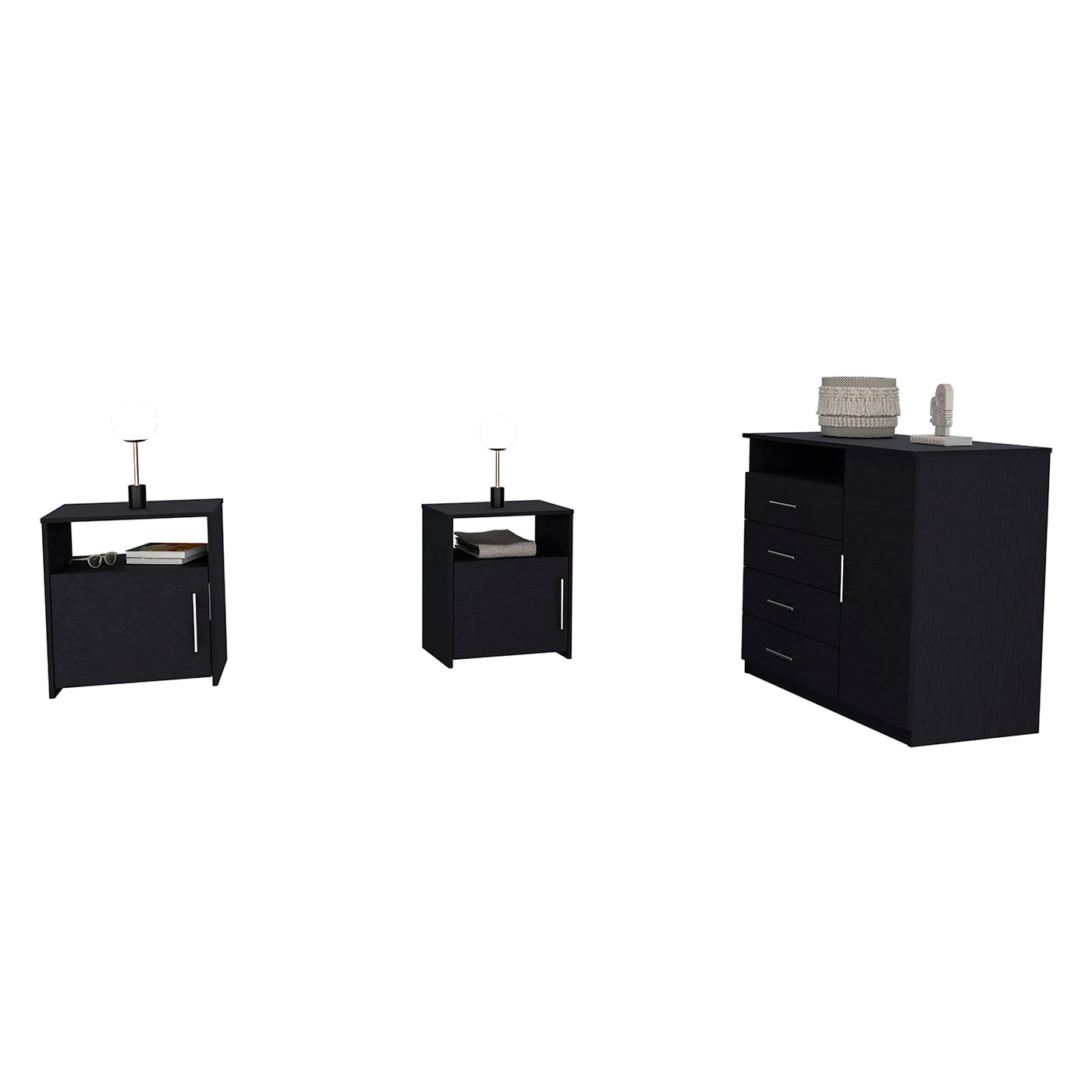With the Solon 3 Piece Bedroom Set, you may discover the ideal balance between usefulness and flair. This set includes a dresser with drawers and two matching nightstands designed in a contemporary black manufactured wood finish. The Solon set creates a stylish and well-organized haven perfect for people looking for a contemporary, unified bedroom. Your bedroom will seamlessly combine contemporary design and usefulness with Solon. The pinnacle of orderly elegance is the Rioja 4 Drawer Dresser. Containing an open storage cabinet for flexibility, four roomy drawers (21.6"W X 6.4"H each), and a single-door cabinet (31.8"H X 12.2"W). For décor or your TV, its roomy top surface (23.6"W X 19"D) is perfect. The Rioja is a chic and helpful answer to your storage problems. The Omaha Nightstand is a stylish and functional piece of furniture with an ample top, ideal for displaying your decor or bedroom essentials (19,88"W X 13,42"D). The open storage shelf (18,42"W X 6,53"H) provides additional space for your bedside essentials. In contrast, the ample single-door cabinet with a handle and interior storage (14,84"H X 18,42"W) offers ample space for more oversized items. Dimensions: Furniture 1, Rioja 4 Drawer Dresser Width: 35,8” Height: 34,8” Depth: 18” Furniture 2 and 3, Omaha Nightstand Width: 19,8” Height: 23” Depth: 13,4”