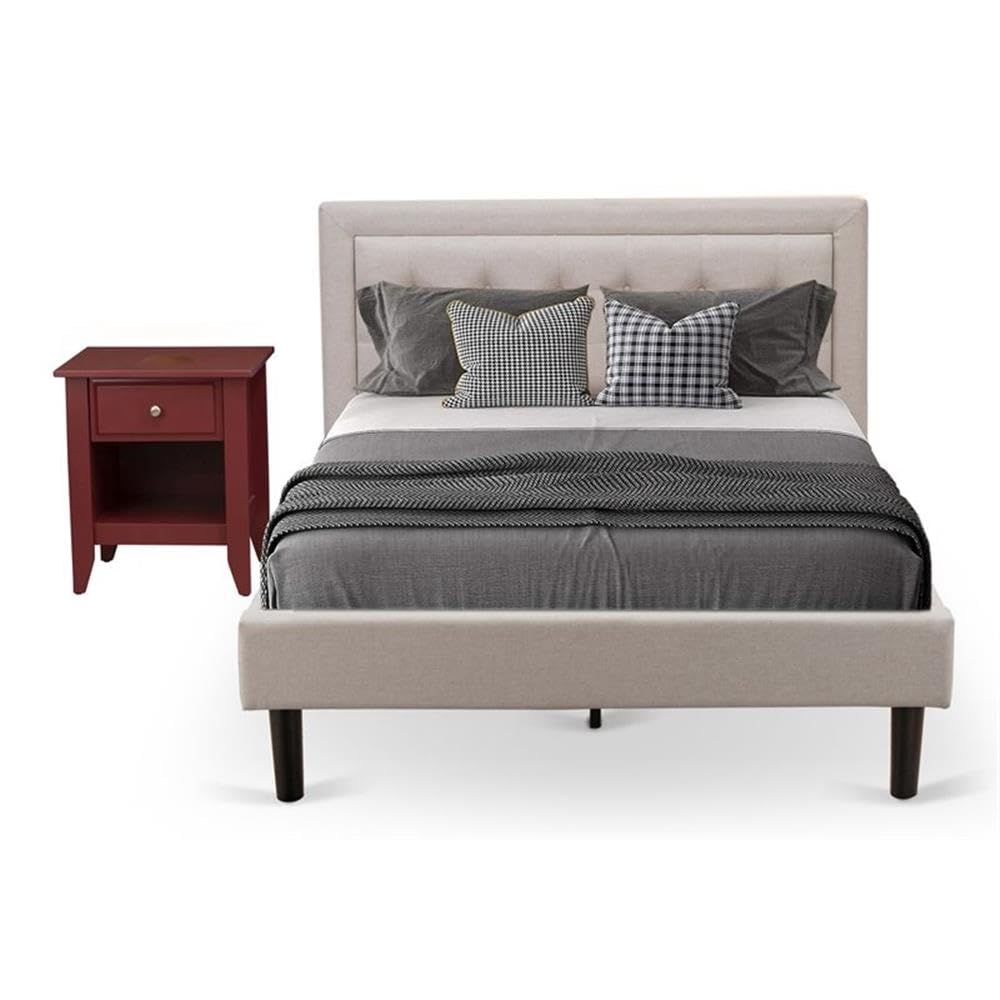 EAST WEST FURNITURE - FN08F-1GA13 - 2-PC PLATFORM BEDROOM FURNITURE SETThis upholstered full size bed set is fantastic to provide a gorgeous appeal to any bedroom. It is time to give your bed room a major style enhance with this upholstered modern bed. We are providing 2 piece bedroom furniture set for master bedroom that contains 1 platform bed frame with a headboard and 1 modern nightstand. This Mist Beige linen fabric Fannin bed frame enhances the appeal of any bedroom to a deluxe level. Our unique creation full size bed set will surely feel comfortable when sitting on this upholstered bed and its plywood slats are great to provide ample support as well as the sturdy equidistant slats enhance durability and extend the life. Everything that you need for assembly is efficiently packed, no additional tools are required for this full size bed set, and all you have to do is to place the modern bed together with your friends or family very quickly and enjoy the happiness of creativity.FULL BEDROOM SET FEATURES Material: Engineer Wood Full Bed Fabric Color: Mist Beige Wood Bed Frame Legs Color: Black Night Stand for Bedrooms Color: Burgundy Dimensions of Upholstered Bed: Length: 84; Width: 59; Height: 41.30. End Table for bedroom dimensions are: Length: 21; Width: 18; Height: 24.Package Includes 1 Platform Bed and 1 Mid Century Modern Nightstand.Note: Fannin Wood Bed Frame, Headboard, Footboard, and Solid wood slats are offered. The mattress will not be included in this Full Size Bedroom Set.