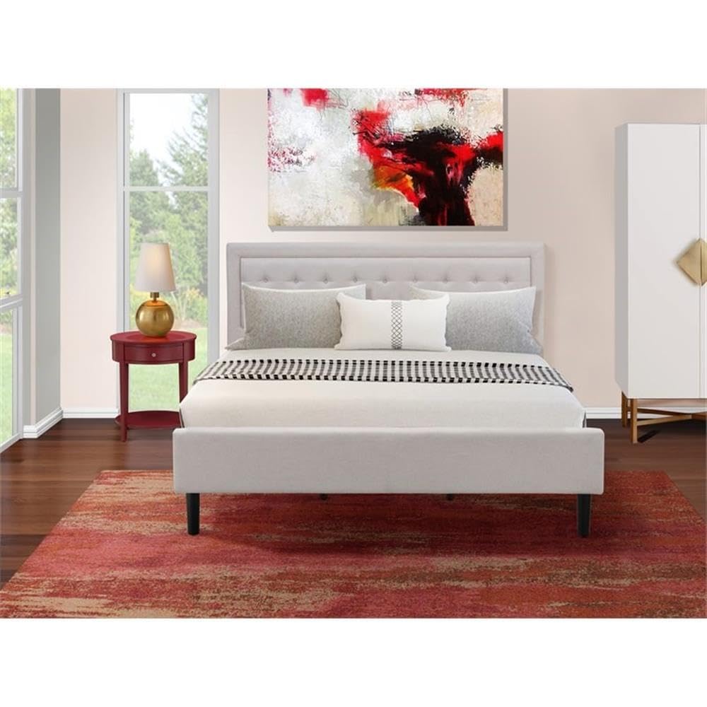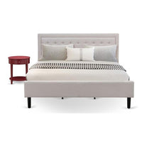 EAST WEST FURNITURE - FN08K-1HI13 - 2-PC PLATFORM KING SIZE BEDROOM SETTransform your bedroom into a stunning haven with this exquisite upholstered king size bed set. Experience a major style upgrade as you introduce this elegant upholstered king size frame. Our 2 piece king bedroom set includes a platform bed with a headboard and a captivating White table, offering a complete and cohesive look. The Mist Beige linen fabric platform king bed adds a touch of luxury to any bedroom. Crafted with comfort in mind, our unique king bedroom set ensures a cozy experience when lounging on the spacious bed. The plywood slats provide ample support, while the sturdy equidistant design enhances durability and prolongs the bed's lifespan. Assembling this wooden bedroom set is hassle-free, as everything you need is efficiently packaged and no additional tools are required. Gather your loved ones, install the bed together, and bask in the joy of creating a beautiful space.KING SIZE BEDROOM SET FEATURES Material: Engineer Wood Mid Century King Bed Fabric Color: Mist Beige King Bed Legs Color: Black Wood Nightstand Color: Burgundy Dimensions of King Bed: Length: 89; Width: 81; Height: 47. Night Stand Dimensions: Length: 23.7; Width: 23.7; Height: 28.Package Includes 1 Modern Bed and 1 End Table.Note: Fannin King Frame, Headboard, Footboard, and hardwood slats are offered. The mattress won't be included in this King Bedroom Set.