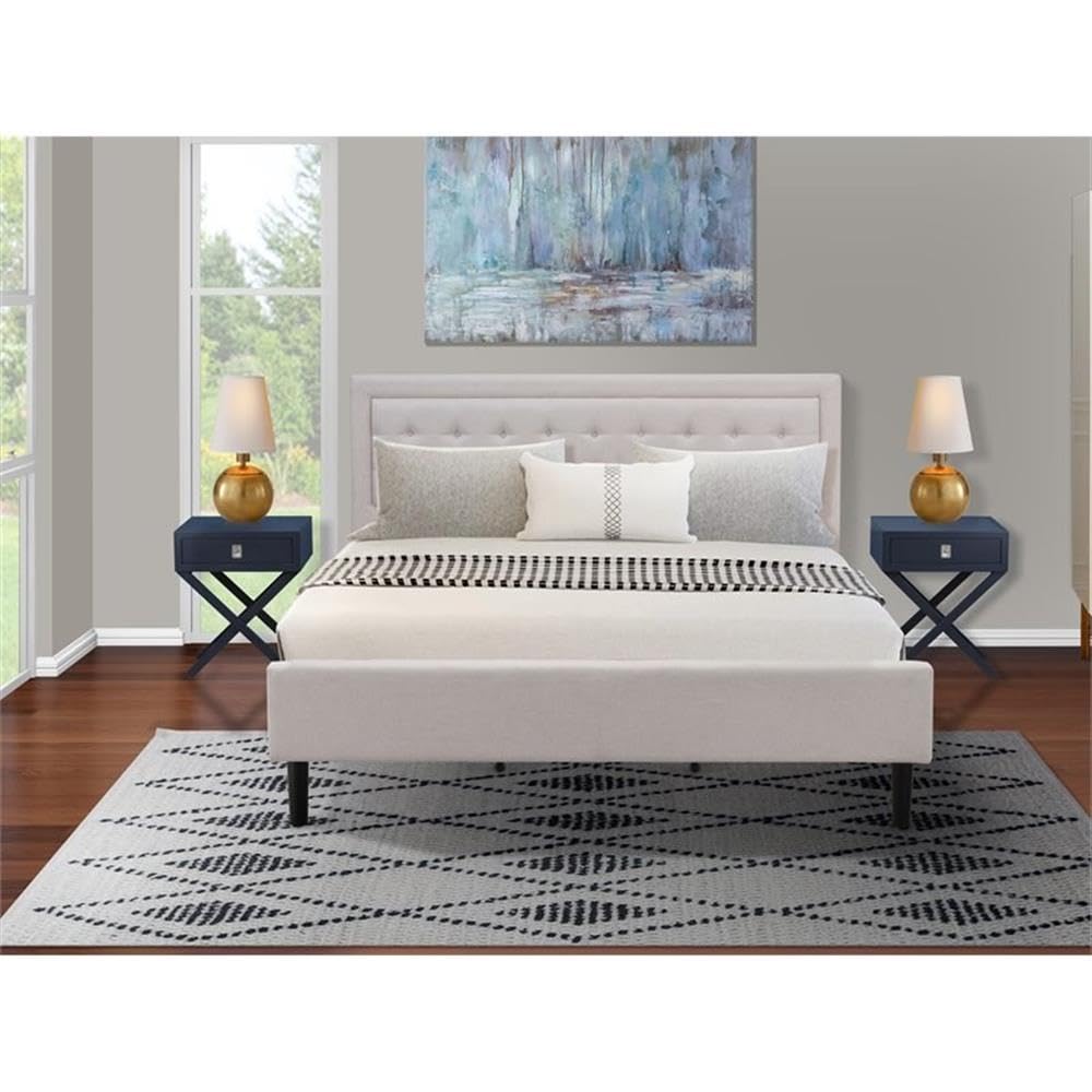 EAST WEST FURNITURE - FN08K-2HAE0 - 3-PC FANNIN KING BEDROOM SETThis impeccably designed upholstered wooden bedroom set is guaranteed to imbue any space with a mesmerizing aesthetic appeal. Prepare to bestow your bedroom with a substantial style upgrade by acquiring this exquisite upholstered king size frame. We proudly present a meticulously crafted 3-piece wooden set for the bedroom, consisting of a regal king size frame with a tastefully designed headboard, accompanied by 2 alluring White tables that effortlessly enhance the ambiance. The Mist Beige linen fabric platform of this king size frame exudes an air of opulence, elevating the allure of any bedroom to a truly deluxe level. Meticulous attention to detail has been dedicated to our exclusive king bedroom set, ensuring unrivaled comfort for all occupants. Moreover, the incorporation of high-quality plywood slats provides unparalleled support, while the sturdy and evenly spaced slats enhance durability, guaranteeing an extended lifespan. Assembly is remarkably straightforward, as every essential component is thoughtfully packed, obviating the need for supplementary tools.BEDROOM SET FEATURES Material: Engineer Wood Mid Century Upholstered Bed Color: Mist Beige Bed Frame Legs Color: Black Small Nightstand Color: White Dimensions of King Size Bed: Length: 89; Width: 81; Height: 47. Modern Nightstand dimensions: Length: 19.7; Width: 15.7; Height: 23.6.Package Includes 1 King Bed and 2 Wood Nightstands.Note: Fannin King Size Frame, Headboard, Footboard, and real wood slats are provided. The mattress will not be included in this Bedroom Set.