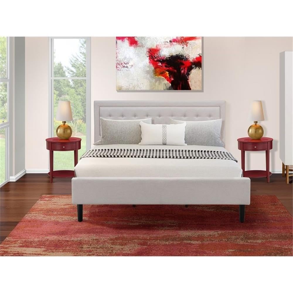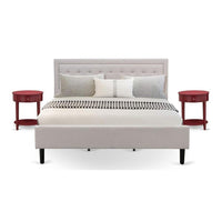 EAST WEST FURNITURE - FN08K-2HI13 - 3-PIECE FANNIN KING SIZE BEDROOM SETTransform your bedroom into an exquisite space with this remarkable upholstered king size bedroom set. Elevate the style of your sleeping quarters by opting for this splendid upholstered king size bed. Our 3-piece bedroom set includes a king bed frame with a headboard and 2 captivating Burgundy nightstands, offering a complete solution for your bedroom decor. The Mist Beige linen fabric of the Fannin king size bed adds a touch of opulence to any bedroom. Designed with utmost care, our unique king bedroom set ensures comfort, thanks to its platform bed and supportive plywood slats. The robust and evenly spaced slats not only enhance durability but also extend the bed's lifespan. With efficient packaging and no requirement for additional tools, assembling this king size bedroom set is a breeze. Gather your loved ones, install the bed in no time, and relish in the joy of creating a beautiful bedroom ambiance.KING SIZE BEDROOM SET FEATURES Material: Engineer Wood Mid Century Platform Bed Frame Color: Mist Beige King Size Bed Legs Color: Black End Table for bedroom Color: Burgundy Dimensions of Bed Frame: Length: 89; Width: 81; Height: 47. Wood Nightstand dimensions: Length: 23.7; Width: 23.7; Height: 28.Package Includes 1 King Size Bed Frame and 2 End Tables.Note: Platform King Size Bed Frame, Headboard, Footboard, and solid wood slats are provided. The mattress will not be included in this Bedroom Set.