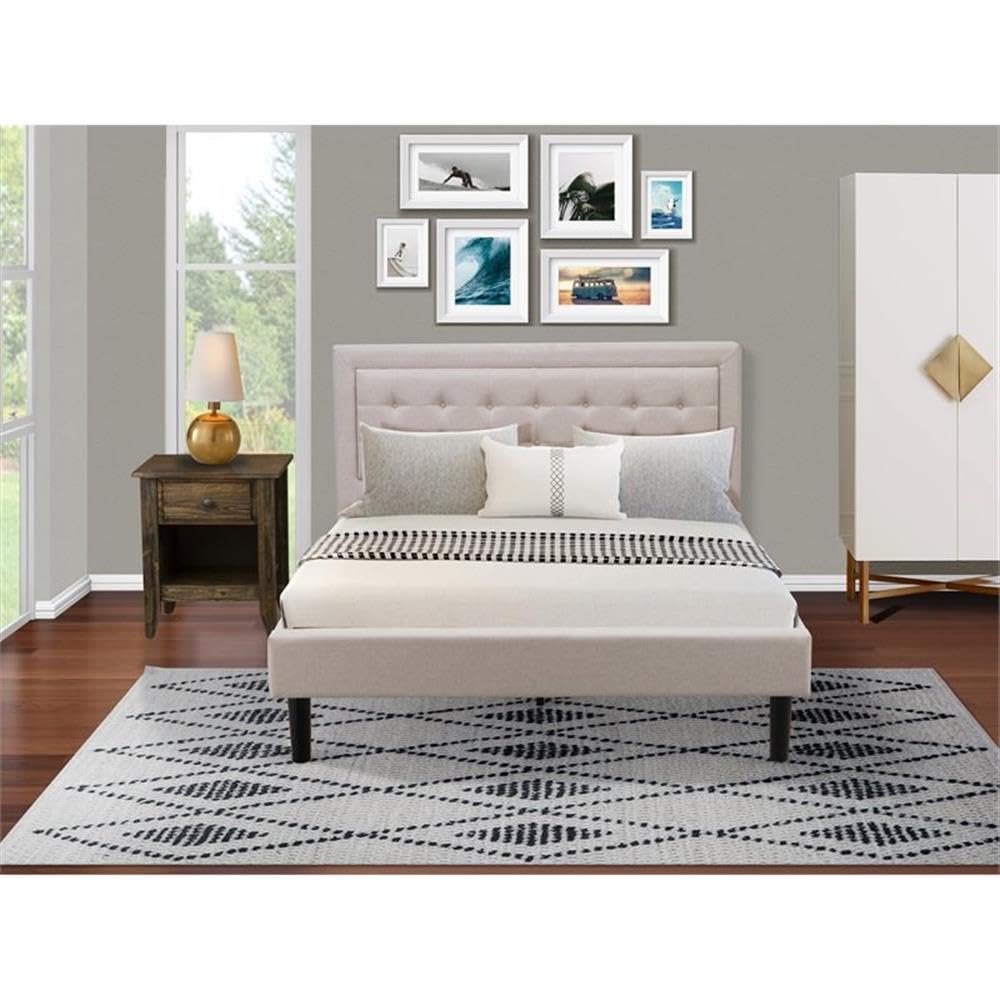 EAST WEST FURNITURE - FN08Q-1GA07 - 2-PC FANNIN QUEEN BED SET FURNITUREImmerse yourself in the captivating beauty of this upholstered bedroom furniture set, designed to infuse any space with stunning appeal. It's time to embark on a significant style upgrade for your bedroom with this upholstered queen bed. Our 2-piece wingback bed set for the bedroom features a queen-size bed with a headboard and an eye-catching Distressed Jacobean end table, perfectly suited for your bedroom. The Mist Beige linen fabric platform wood bed frame takes the allure of any bedroom to an opulent level. Experience unparalleled comfort while seated on this queen bed frame, thanks to our unique creation of the wingback bed set. The plywood slats provide ample support, while the sturdy equidistant slats enhance durability and extend its lifespan. All the necessary assembly components are efficiently packaged, eliminating the need for additional equipment for this queen bedroom set furniture.BEDROOM SET FEATURES Material: Engineer Wood Mid Century Wood Queen Bed Frame Fabric Color: Mist Beige Wood Bed Frame Legs Color: Black Bedroom Nightstand Color: Distressed Jacobean Dimensions of Queen Frame: Length: 89; Width: 65; Height: 41.30. Mid Century Nightstand dimensions: Length: 21; Width: 18; Height: 24. Package Includes 1 Queen Bedframe and 1 Modern Nightstand.Note: Platform Upholstered Bed, Headboard, Footboard, and wooden slats are provided. The mattress won't be included in this Bedroom Set.
