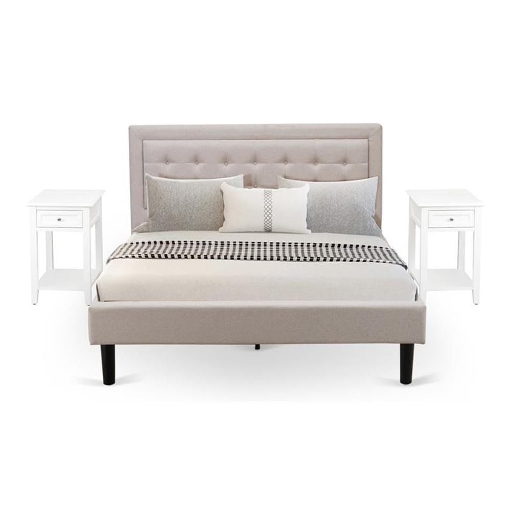 East West Furniture FN08Q-2DE05 3-Piece Platform Queen Bedroom Set with 1 Upholstered Bed and 2 Small Nightstands - Mist Beige Linen Fabric