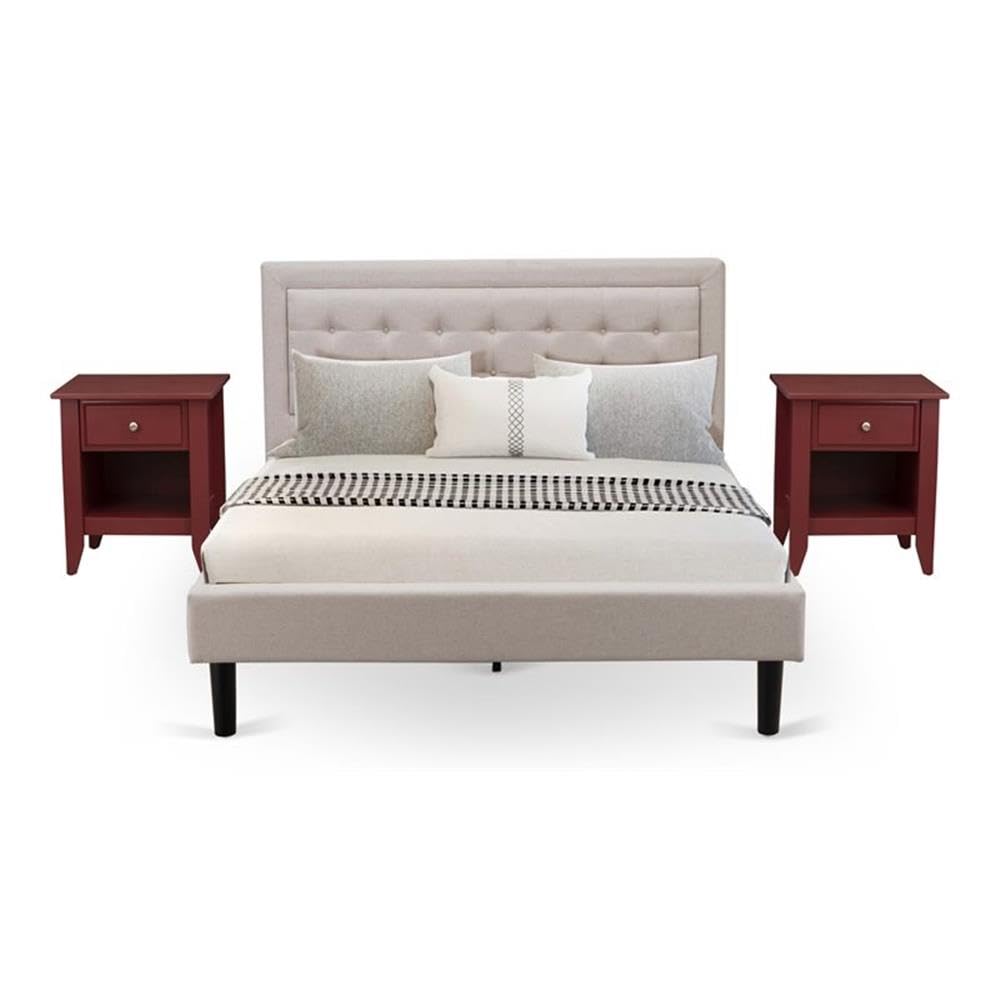 EAST WEST FURNITURE - FN08Q-2GA13 - 3-PIECE FANNIN WINGBACK BED SETElevate the aesthetic appeal of any space with this remarkable upholstered bedroom set. It's time to give your master bedroom a striking style upgrade with the addition of this upholstered bed. Our 3-piece bedroom furniture set includes a queen wood bed frame with a headboard and two eye-catching mid-century Burgundy nightstands. The Mist Beige linen fabric upholstery of the Fannin queen frame adds a touch of deluxe sophistication to any bedroom. This unique bedroom set offers exceptional comfort when sitting on the queen bed frame, while the sturdy plywood slats provide ample support. The equidistant slats not only enhance durability but also extend the lifespan of the bed. Assembly is a breeze as everything required is thoughtfully packed, eliminating the need for additional tools. Simply gather your family or friends, and in no time, you can install the bed together, reveling in the joy of creating a beautiful space.QUEEN BEDROOM SET FEATURES Material: Engineer Wood Mid Century Queen Wood Bed Frame Fabric Color: Mist Beige Queen Wood Bed Frame Legs Color: Black Wood Nightstands Color: Burgundy Dimensions of Queen Bedframe: Length: 89; Width: 65; Height: 41.30. End Tables for bedroom dimensions: Length: 21; Width: 18; Height: 24.Package Includes 1 Platform Bed and 2 Small End Tables.Note: Platform wooden Bed Frame, Headboard, Footboard, and solid wood slats are provided. The mattress will not be included in this bed set.