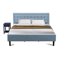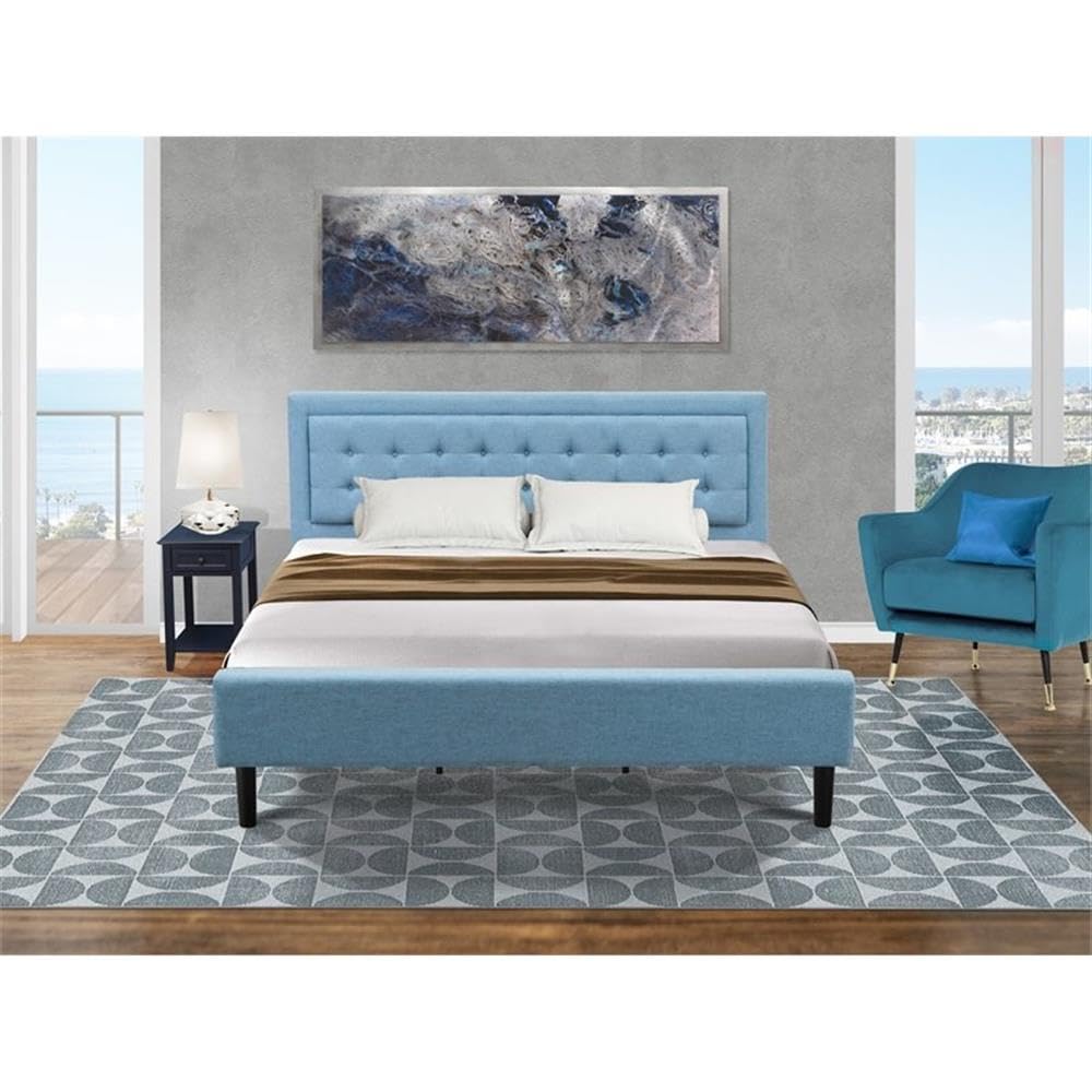 EAST WEST FURNITURE - FN11K-1DE15 - 2-PC FANNIN KING SIZE BED SETEnhance the style of your master bedroom with this remarkable upholstered king size bed set, designed to create a stunning ambiance in any space. The set includes a king frame with a headboard and a captivating nightstand, making it a complete 2-piece bedroom ensemble. Featuring a Denim Blue linen fabric platform, the king frame exudes luxury and enhances the overall allure of your bedroom. The accompanying nightstand boasts two USB ports and two outlets, providing the ultimate convenience for charging your mobile devices or connecting your computer without the hassle of searching for sockets on the floor. Crafted with precision, our unique wooden bedroom set ensures both comfort and durability. The plywood slats offer ample support, while the sturdy equidistant design enhances longevity. Assembling this king size bed set is a breeze, as everything you need is efficiently packed and no additional tools are required.KING SIZE BED SET FEATURES Material: Engineer Wood Mid Century Bed Headboard Color: Denim Blue Platform Bed Frame Legs Color: Black Small End Table Color: Navy Blue Dimensions of Platform Bed: Length: 89; Width: 81; Height: 47. Small Nightstand dimensions: Length: 23.70; Width: 15.70; Height: 24.Package Includes 1 King Size Bed Frame and 1 Small Nightstand.Note: Platform King Size Bed Frame, Headboard, Footboard, and hardwood slats are provided. The mattress won't be included in this King Bedroom Set.