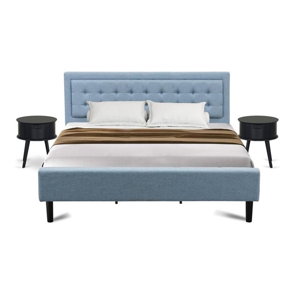 East West Furniture FN11K-2GO15 3-Piece Platform King Size Bedroom Set with 1 King Size Frame and 2 End Tables for bedroom - Reliable and Sturdy Construction - Denim Blue Linen Fabric