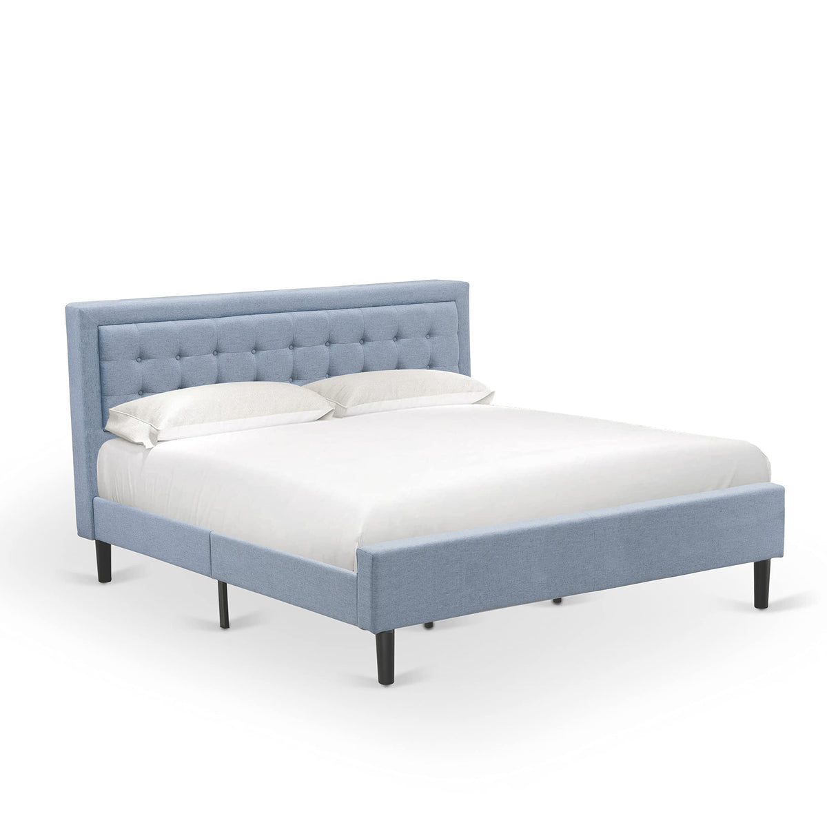 EAST WEST FURNITURE - FN11K-2VL0C - 3-PIECE PLATFORM KING SIZE BEDROOM SETThis upholstered wingback bed set is an exceptional choice for enhancing the visual appeal of any space. Experience a significant style upgrade for your bedroom with this impeccably designed upholstered platform bed. Our comprehensive 3 pc king size bedroom set includes a striking mid-century bed with a headboard, along with two eye-catching small end tables. The Denim Blue linen fabric platform bed elevates the allure of any bedroom to a luxurious level. Crafted with meticulous attention to detail, our exclusive bed set guarantees optimal comfort, while the robust plywood slats provide exceptional support and durability. The equidistant slats further reinforce its strength and extend its lifespan. Effortless assembly is ensured as all necessary components are efficiently packaged, eliminating the need for additional tools. Simply gather your family or friends, install the bed, and revel in the satisfaction of a beautifully designed space.KING BEDROOM SET FEATURES Material: Engineer Wood Mid Century Upholstered Bed Color: Denim Blue King Size Bed Frame Legs Color: Black Night Stand Color: Wire Brushed Butter Cream Dimensions of Modern Bed: Length: 89; Width: 81; Height: 47. Small End Table Dimensions: Length: 22; Width: 15.7; Height: 28.Package Includes 1 Upholstered Bed and 2 End Tables for bedroom.Note: Platform King Frame, Headboard, Footboard, and wood slats are offered. The mattress will not be included in this King Bedroom Set.