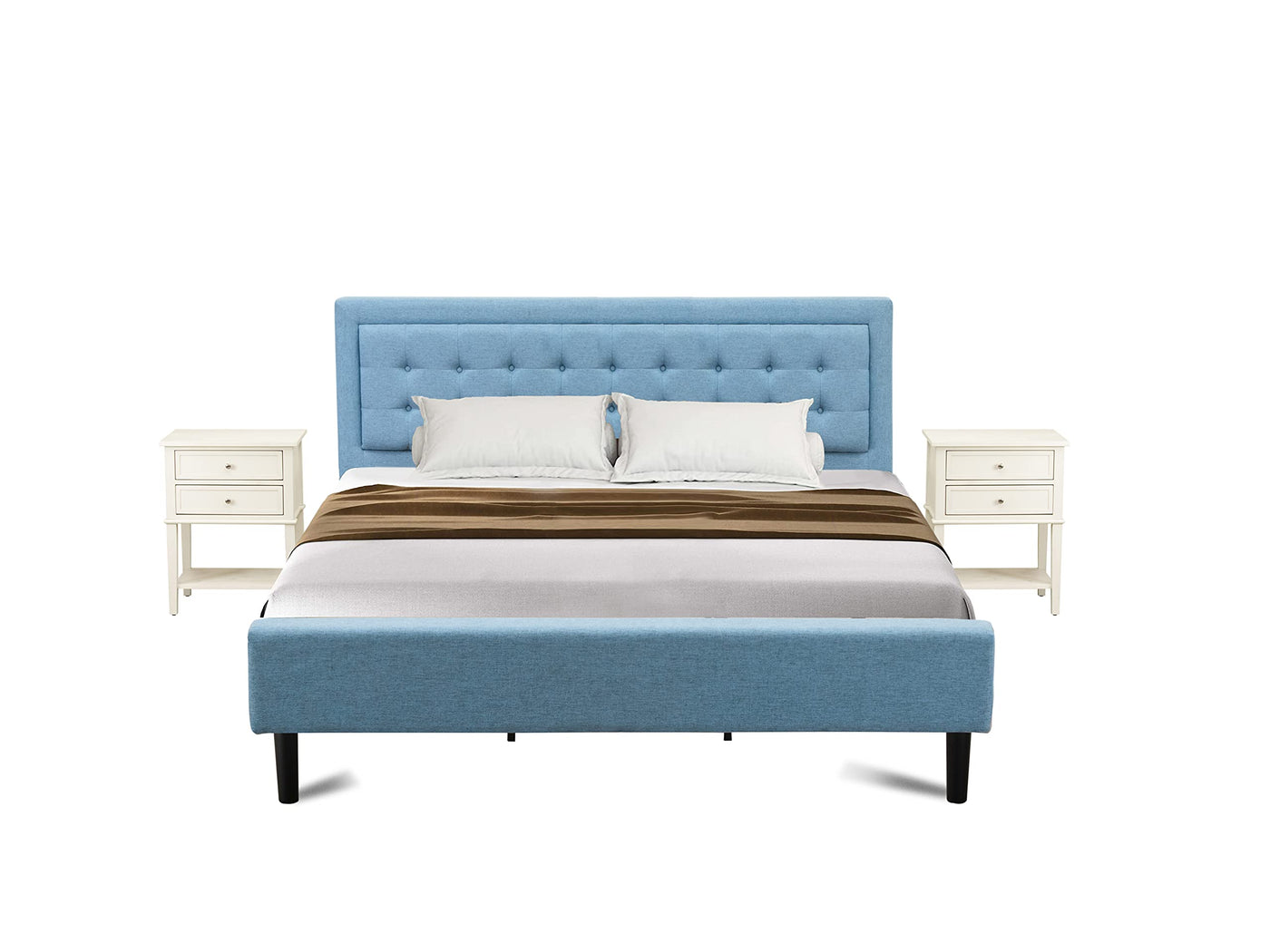 East West Furniture FN11K-2VL0C 3-Piece Platform Bed Set with 1 Modern Bed and 2 Bedroom Nightstands - Reliable and Sturdy Manufacturing - Denim Blue Linen Fabric
