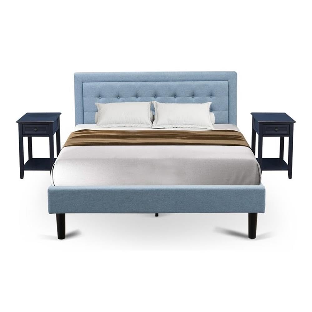 East West Furniture FN11Q-2DE15 3-Piece Platform Bed Set with 1 Queen Bed Frame and 2 Night Stands - Denim Blue Linen Fabric