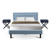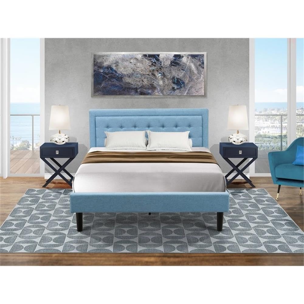 East West Furniture FN11Q-2HA15 3-Piece Fannin Wooden Set for Bedroom with 1 Platform Bed Frame and 2 Modern Nightstands - Reliable and Sturdy Construction - Denim Blue Linen Fabric