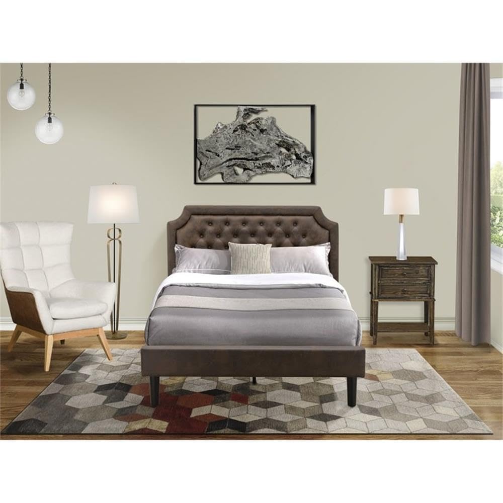 EAST WEST FURNITURE - GB25F-1VL07 - 2-PC PLATFORM FULL SIZE BED SETIntroducing our luxurious and comfortable modern bed, featuring exquisite faux leather cushioned padding that adds an element of opulence to any bedroom. We are delighted to offer a 2-piece wooden set for bedrooms, consisting of a platform bed frame with a headboard, and a visually appealing nightstand. This upholstered bed is the perfect choice for classic bedroom aesthetics while also providing a unique twist to modern settings. Our full size bedroom set includes a beautifully designed end table that complements the overall style. With robust wooden slats, this bed ensures excellent support and minimizes any potential sagging, accommodating both inner-spring and foam mattresses. Keeping our full bedroom set clean is effortless due to its smooth finish, allowing for easy maintenance with a damp cloth. Assembly is a breeze with the step-by-step instructions and hardware pack provided, making the process simple and hassle-free.BED SET FEATURES Material: Engineered Wood Full Bed faux leather headboard color: Dark Brown Modern Bed Legs Color: Black Small Nightstand Color: Distressed Jacobean Dimensions of Modern Bed: Length: 84; Width: 59; Height: 47. Night Stand Dimensions: Length: 22; Width: 15.7; Height: 28.Package Includes: 1 Upholstered Bed and 1 End Table for bedroom.Note: Mid Century Bed, Headboard, and hardwood slats are provided. The mattress will not be included in this Full Size Bedroom Set.