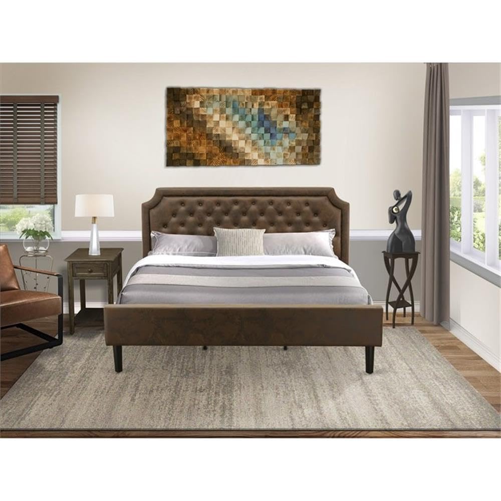 EAST WEST FURNITURE - GB25K-1DE07 - 2-PC GRANBURY KING SIZE BED SETIntroducing our appealing king size frame, adorned with faux leather cushioned padding, designed to create a luxurious and relaxing ambiance in any room. We are pleased to present a 2-piece king bedroom set, featuring a modern bed with a headboard, along with an attractive contemporary nightstand. This upholstered bed is a perfect fit for both classic and contemporary bedrooms, adding a unique touch to any environment. Our king bedroom furniture set includes a traditional end table, which not only enhances the aesthetics but also offers added convenience. With two USB ports and two outlets, you can conveniently charge up to two mobile devices simultaneously or connect your computer without the hassle of searching for a socket on the floor. The durable wood slats ensure optimal support and minimize any sagging, catering to both inner-spring and foam mattresses. Cleaning our king size bed set is effortless, thanks to its smooth finish that can be easily wiped down with a damp cloth. Assembling the king bed frame is a straightforward process, facilitated by the step-by-step assembly instructions and equipment pack provided.BED SET FEATURES Material: Engineered Wood King Size Bed faux leather headboard color: Dark Brown Bed Frame Legs Color: Black End Table Color: Distressed Jacobean Dimensions of king bed frame: Length: 89; Width: 81; Height: 47. End Tables Dimensions: Length: 23.7; Width: 15.7; Height: 24.Package Includes 1 Mid Century Bed and 1 Mid Century Nightstand.Note: Mid Century Bed, Headboard, and solid wood slats are included. The mattress will not be included in this King Bedroom Furniture Set.