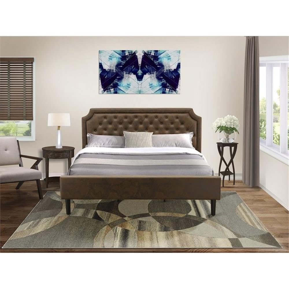 EAST WEST FURNITURE - GB25K-1HI07 - 2-PC PLATFORM KING BEDROOM SETIntroducing our exquisite bed frame, featuring a luxurious faux leather cushioned dark brown padding that brings a touch of opulence and comfort to any bedroom. As part of our 2 pc bedroom set, this package includes an upholstered bed with a headboard, as well as an appealing small end table. Whether in a traditional setting or a contemporary environment, this king-size bed frame adds a unique twist to your decor. With its timeless design, our bed set includes one end table that exudes a classic charm. The durable hardwood slats provide exceptional support, ensuring minimal sagging for both inner spring and foam mattresses. Cleaning is a breeze thanks to the smooth finish, which can be effortlessly wiped down with a damp cloth. Assembly is a simple process with our step-by-step instructions and conveniently packaged components, allowing you to quickly set up this button-tufted king size bed frame to perfection.BED SET FEATURES Material: Engineered Wood King Bedframe color: Dark Brown Mid Century Bed Legs Color: Black End Table Color: Distressed Jacobean Dimensions of wood bed frame: Length: 89; Width: 81; Height: 47. Wood Nightstand Dimensions: Length: 23.7; Width: 23.7; Height: 28.Package Includes 1 Platform Bed Frame and 1 Night Stand.Note: Platform Bed, Headboard, and wooden slats are provided. The mattress will not be included in this King Bedroom Set.