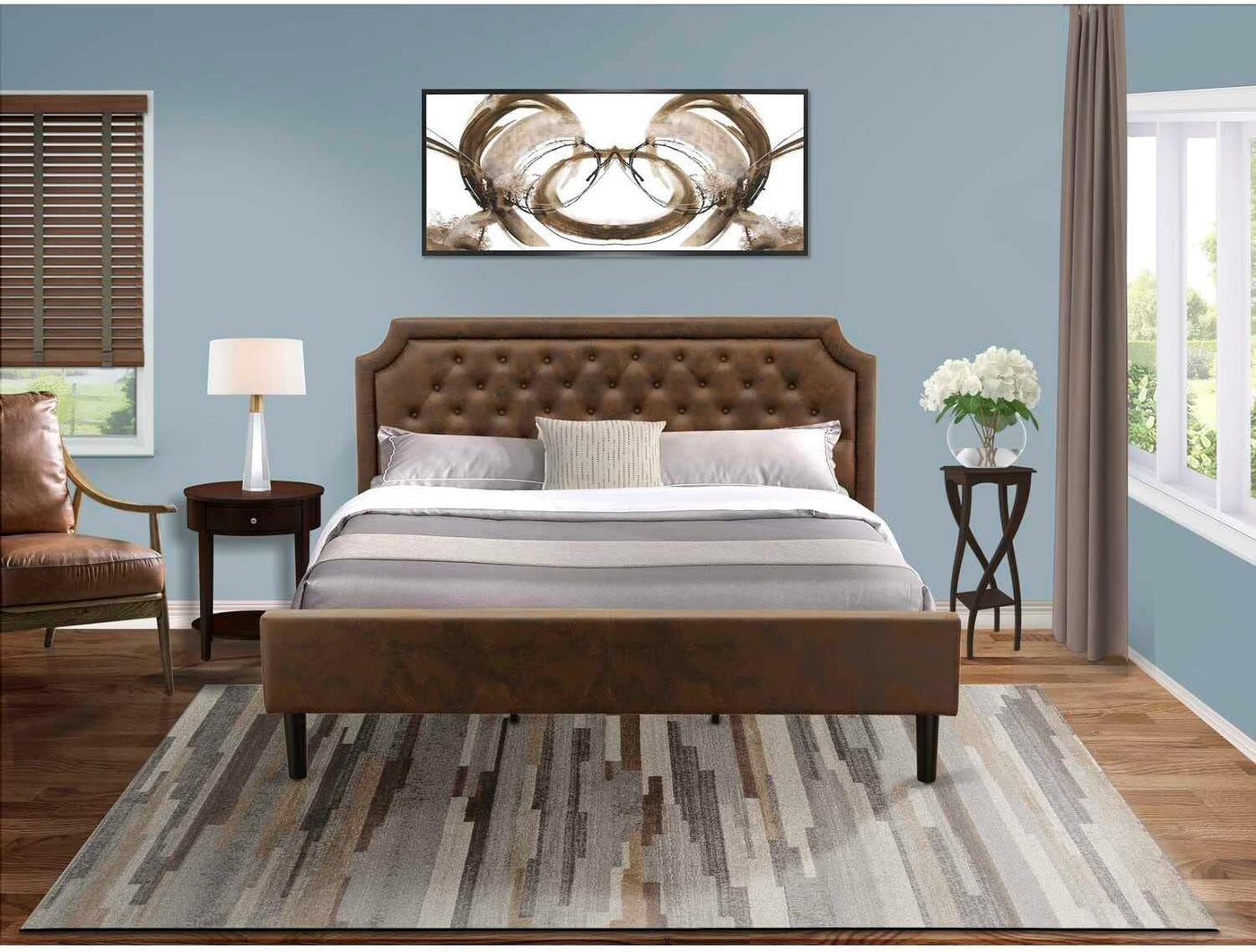 EAST WEST FURNITURE - GB25K-1HI0M - 2-PC PLATFORM BED SETExperience the epitome of luxury and relaxation with our stunning modern bed, featuring faux leather cushioned dark brown padding. It has the ability to transform any bedroom into a lavish and tranquil space for restful nights. We proudly present a 2-piece wooden set for the bedroom, which includes a king-size bed with a headboard and an eye-catching nightstand. This king-size bed effortlessly complements classic bedrooms while adding a distinctive twist to modern environments. Our king bedroom furniture set features a modern nightstand with traditional styling, adding a touch of elegance to the overall aesthetic. With durable hardwood slats, this bed provides excellent support, minimizing sagging for both inner-spring and foam mattresses. Cleaning is a breeze, thanks to the smooth finish that can be easily wiped clean with a damp cloth. Assembling the platform bed frame is a simple task, as we provide step-by-step assembly instructions and a comprehensive hardware pack for your convenience.KING BEDROOM FURNITURE SET FEATURES Material: Engineered Wood Mid Century Bed faux leather headboard color: Dark Brown King Size Frame Legs Color: Black Mid Century Nightstand Color: Antique Mahogany Dimensions of platform bed frame: Length: 89; Width: 81; Height: 47. Small End Table Dimensions: Length: 23.7; Width: 23.7; Height: 28.Package Includes 1 Wood Bed Frame and 1 Night Stand For Bedrooms.Note: King Bed, Headboard, and wooden slats are provided. The bed mattress will not be included in this King Size Bed Set.