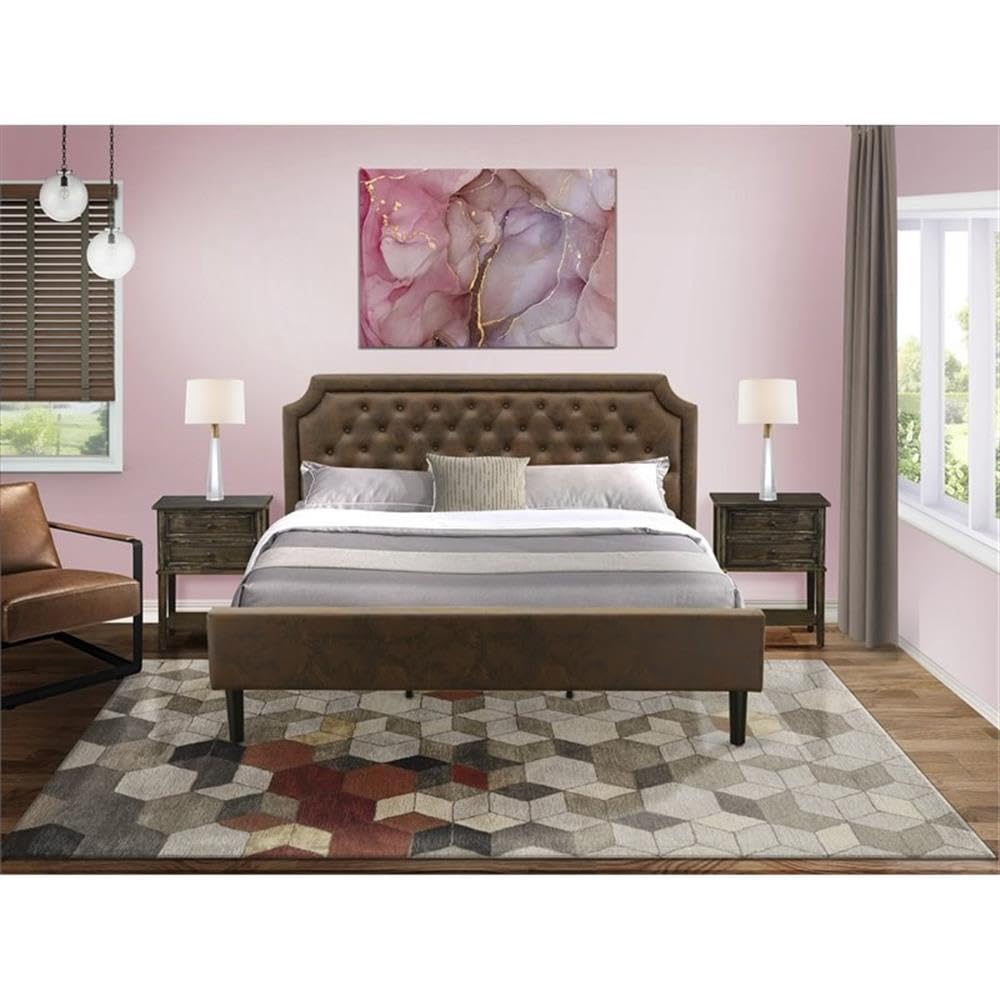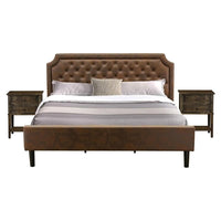 EAST WEST FURNITURE - GB25K-2VL07 - 3-PC PLATFORM BED SETExperience the epitome of luxury and comfort with our stunning mid-century bed, featuring gorgeous faux leather cushioned dark brown padding. This bed has the power to transform any room into a lavish and inviting space for relaxation. Our 3-piece wooden bedroom set includes a platform bed frame with a headboard and two captivating end tables. Whether you have a traditional or contemporary bedroom, this king frame adds a unique touch to any setting. The set also features two small nightstands, boasting a classic appearance. With sturdy hardwood slats, this king-size bed offers exceptional support and prevents sagging, accommodating both innerspring and foam mattresses. Cleaning is a breeze, thanks to the smooth finish that allows you to easily wipe it down with a damp cloth. Assembly is hassle-free with our provided step-by-step instructions and hardware pack, making it effortless to assemble this modern button-tufted bed.BEDROOM SET FEATURES Material: Engineered Wood King Bed faux leather headboard color: Dark Brown King Frame Legs Color: Black Night Stands For Bedrooms Color: Distressed Jacobean Dimensions of king frame: Length: 89; Width: 81; Height: 47. Small End Table Dimensions: Length: 22; Width: 15.7; Height: 28.Package Includes 1 Mid Century Bed and 2 Night Stands For Bedrooms.Note: Modern Bed, Headboard, and solid wood slats are included. The mattress will not be included in this King Size Bed Set.
