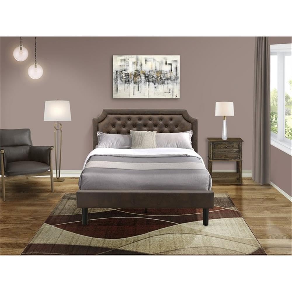 EAST WEST FURNITURE - GB25Q-1VL07 - 2-PC GRANBURY BEDROOM FURNITURE SETOur 2-piece bed set includes a queen bed frame with an elegant headboard and a captivating end table, perfectly complementing your bedroom decor. The queen size frame adds a touch of timeless elegance to classic bedrooms while also providing a unique twist to modern settings. Our sophisticated platform bed features an intricate black texture on its dark brown faux leather upholstery, showcasing a high-end design. Crafted with great care by our skilled artisans, the bed's sleek black legs add a touch of elegance. Moreover, the accompanying small end table is beautifully coated in a Distressed Jacobean finish. This bed set is an excellent option for impressing all the guests who visit your home. It effortlessly transforms any bedroom into a lavish and tranquil haven for restful nights. The accompanying nightstand boasts a modern design with a hint of classic charm. Thanks to the durable hardwood slats, this bed frame offers exceptional support, preventing sagging and ensuring optimal comfort for both inner-spring and foam mattresses. Cleaning is a breeze, as the smooth finish can be easily wiped clean with a damp cloth. Assembling the queen bed frame is a hassle-free task, with step-by-step instructions and all the necessary hardware included in the package.QUEEN BEDROOM SET FEATURES Material: Engineered Wood Wood Queen Bed faux leather headboard color: Dark Brown Mid Century Bed Legs Color: Black End Table Color: Distressed Jacobean Dimensions of queen bed frame: Length: 89; Width: 65; Height: 47. Small Nightstand Dimensions: Length: 22; Width: 15.7; Height: 28.Package Includes 1 Queen Size Frame and 1 End Table.Note: Wood Bed Frame, Headboard, and wooden slats are included. The mattress will not be included in this Queen Bed Set Furniture.