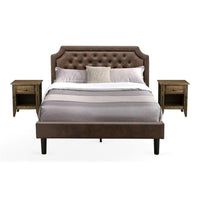 EAST WEST FURNITURE - GB25Q-2GA07 - 3-PC GRANBURY BED SETOur gorgeous faux leather cushioned padding platform bed frame will make any room lavish and comfortable to sleep in. We are offering a 3 pc wooden set for bedroom that contains 1 button tufted wood queen bed frame with a headboard and 2 attractive end tables. This queen size bed is perfect for classic bedrooms as well as a unique twist to any contemporary environment. Our wooden set for bedroom has 2 end tables with a classic appearance. Durable solid wood slats offer better support and less sagging for both inner-spring and foam mattresses. Our wooden set for bedroom is simple to clean along with a damped cloth because of its smooth finish. This queen bed frame can be simply assembled with the provided step-by-step assembly instruction and hardware pack.WOODEN SET FOR BEDROOM FEATURES Material: Engineered Wood Platform Bed faux leather headboard color: Dark Brown Mid Century Bed Legs Color: Black Wood Nightstand Color: Distressed Jacobean Dimensions of queen bedframe: Length: 89; Width: 65; Height: 47. End Tables for bedroom Dimensions: Length: 21; Width: 18; Height: 24.Package Includes: 1 Platform Bed Frame and 2 End Tables for bedroom.Note: Modern Bed, Headboard, and hardwood slats are included. The mattress will not be included in this Queen Bedroom Set.