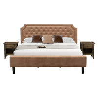 East West Furniture GB28K-2GA07 3-Piece Platform Bed Set with Button Tufted Modern Bed and 2 Distressed Jacobean End Tables - Brown faux Leather with Brown Texture and Black Legs