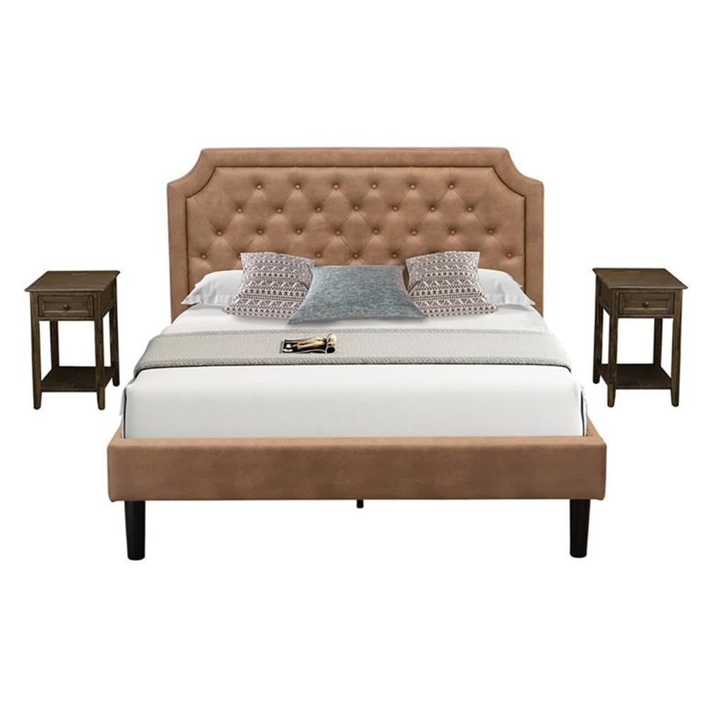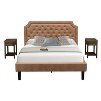EAST WEST FURNITURE - GB28Q-2DE07 - 3-PC GRANBURY WOODEN SET FOR BEDROOMOur 3-piece bed set, you'll receive a button-tufted bed with a headboard, along with 2 charming wood nightstands. This platform bed frame is not only perfect for traditional bedrooms but also adds a unique touch to any contemporary setting. The platform bed frame's legs are meticulously crafted by our skilled carpenters in a sleek black finish, while the brown faux leather upholstery showcases a rich texture. The wood nightstand beautifully matches with a Distressed Jacobean finish. This bed set possesses an enchanting allure that is sure to captivate the attention of all your home's visitors. Moreover, its carefully chosen color combination ensures seamless compatibility with any bedroom decor. Enhancing the functionality of your bedroom, our set includes two mid-century nightstands with a timeless design. These end tables come with two USB ports and two outlets, allowing you to conveniently charge up to two mobile devices simultaneously or connect your computer without the hassle of searching for a floor socket. With sturdy wooden slats, our bed set provides exceptional support, preventing both inner-spring and foam mattresses from sagging.WOODEN SET FOR BEDROOM FEATURES Material: Engineered Wood Mid Century Bed color: Brown Wood Bed Frame Legs Color: Black Mid Century Nightstand Color: Distressed Jacobean Dimensions of platform bed frame: Length: 89; Width: 65; Height: 47. End Tables Dimensions: Length: 23.7; Width: 15.7; Height: 24.Package Includes 1 Queen Size Frame and 2 Night Stands.Note: Wood Bed Frame, Headboard, and hardwood slats are provided. The mattress will not be included in this Bed Set.