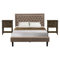 EAST WEST FURNITURE - KD16Q-2VL07 - 3 PIECE QUEEN SIZE BEDROOM SETEnhance the elegance of any bedroom in your home with this exquisite bed set. Our queen size 3 Piece ensemble consists of a platform bed frame and two nightstands, each featuring two drawers. With its versatility, our queen size bedroom set seamlessly complements any style of decor, leaving a lasting impression on anyone who visits your home. Crafted from engineered wood, both the platform bed and modern nightstands offer exceptional strength and support for both you and your mattress. The bed showcases a striking wooden headboard, serving as the centerpiece of your bedroom and providing a comfortable spot to lean back and unwind. Its foam padding is covered in luxurious Dark Khaki Linen Fabric, ensuring a delightful touch. This bedroom set is designed for hassle-free maintenance and proves to be budget-friendly. Assembly instructions for the headboard, footboard, wood slats, and other accessories are included in the package, making the assembly process a breeze. The Linen Fabric headboard is effortlessly cleaned and consistently emanates a captivating appeal. By adding our product to your room, you will elevate its beauty and create a soothing ambiance.QUEEN SIZE BEDROOM SET FEATURES: Material: Engineered Wood Queen Size Platform Bed Frame Color: Dark Khaki Queen Size Bed Legs Color: Black Bedroom Nightstand Top Color: Distressed Jacobean Bedroom Nightstand Legs Color: Distressed Jacobean Dimensions of queen platform bed: Length: 89; Width: 65; Height: 47. Night Stands Dimensions: Length: 22; Width: 15.7; Height: 28.Include in this Package: 1 Queen Platform Bed and 2 Mid Century Modern NightstandNote: Mattress is not included with this Queen Size Platform Bed Frame.
