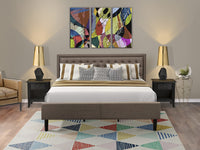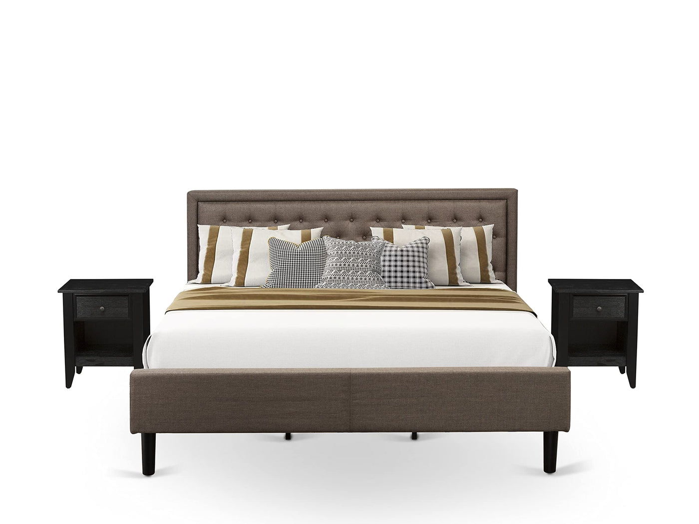 EAST WEST FURNITURE - KD18K-2GA06 - 3 PIECE KING BEDROOM SETEnhance the elegance of your bedroom with this exquisite wooden bedroom set, which serves as a remarkable addition to any home. Our 3 Piece bedroom set comprises a single wooden bed frame and 2 contemporary nightstands, each equipped with a convenient drawer. This wood bedroom set effortlessly complements various decor styles, leaving a lasting impression on your house guests. Crafted using engineered wood, our king platform bed and nightstands offer robust support for both you and your mattress. The bed's versatile design showcases a sturdy wooden headboard that serves as the centerpiece of your bedroom, providing a comfortable spot to lean on and unwind. Adorned with foam padding and covered in Brown Linen Fabric, the headboard exudes an inviting appeal. Furthermore, this wood bedroom set requires minimal upkeep, making it an excellent choice for those on a budget. Assembly instructions for the headboard, footboard, wooden slats, and other accessories are included in the package, facilitating a swift and hassle-free assembly process. The Linen Fabric headboard is easily cleaned, ensuring its lasting allure. Allow our product to enhance the aesthetic appeal of your room and elevate your overall well-being.WOOD BEDROOM SET FEATURES: Material: Engineered Wood King Size Bed Color: Brown Wood Bed Frame Legs Color: Black Small Night Stand Top Color: Wire Brushed Black Wooden Nightstand Legs Color: Wire Brushed Black Dimensions of Platform Bed: Length: 89; Width: 81; Height: 47. Night Stands Dimensions: Length: 21; Width: 18; Height: 24.Include in this Package: 1 King Size Platform Bed Frame and 2 Bedroom NightstandNote: Mattress is not included with this King Bed Frame.