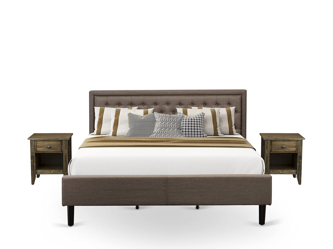 East West Furniture KD18K-2GA07 3 Piece Bed Set - 1 King Platform Bed Frame Brown Linen Fabric Padded and Button Tufted Headboard with 2 Bedroom Nightstand - Distressed Jacobean Finish Nightstand