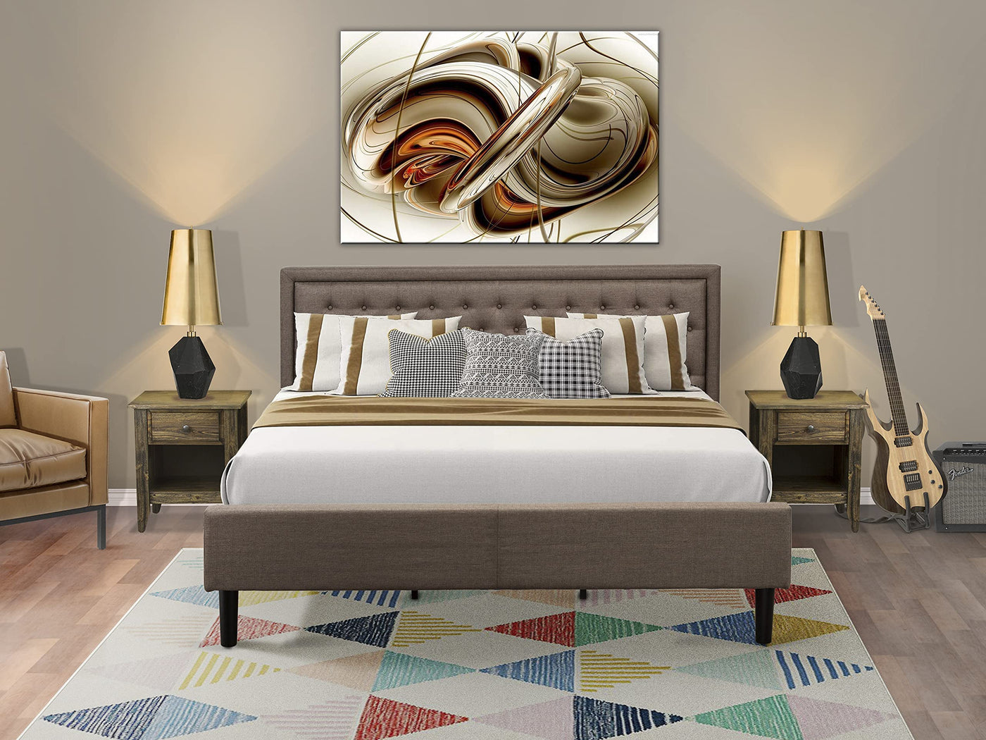 EAST WEST FURNITURE - KD18K-2GA07 - 3 PC KING SIZE BEDROOM SETEnhance the appearance of any bedroom in your home with this exquisite wooden bedroom set. Comprising a 3-piece arrangement, this set includes a king-size bed frame and two nightstands, each equipped with a convenient drawer. The versatility of our king bed set ensures it harmonizes flawlessly with any style of decor, impressing all who enter your home. Engineered wood has been skillfully employed in the construction of the king-size platform bed frame and nightstands, ensuring sturdy support for both you and your mattress. The bed's eye-catching wooden headboard serves as a striking centerpiece in your bedroom, offering a comfortable place to lean and unwind, with its foam padding upholstered in elegant Brown Linen Fabric. This wood bedroom set requires minimal upkeep and is an excellent choice for those on a budget. You'll find step-by-step assembly instructions for the headboard, footboard, wood slats, and other accessories included in the package, allowing you to quickly and easily assemble the furniture. The Linen Fabric headboard is effortless to clean and consistently exudes a captivating charm. By adding our product to your room, you will enhance its beauty and create a welcoming atmosphere.BEDROOM SET FEATURES: Material: Engineered Wood Platform Bed Color: Brown Wood Bed Frame Legs Color: Black Small Night Stand Top Color: Distressed Jacobean Wooden Night Stand Legs Color: Distressed Jacobean Dimensions of Bed Frame: Length: 89; Width: 81; Height: 47. Wooden Night Stand Dimensions: Length: 21; Width: 18; Height: 24.Include in this Package: 1 King Platform Bed Frame and 2 Nightstand BedroomNote: Mattress is not included with this King Bed Frame.