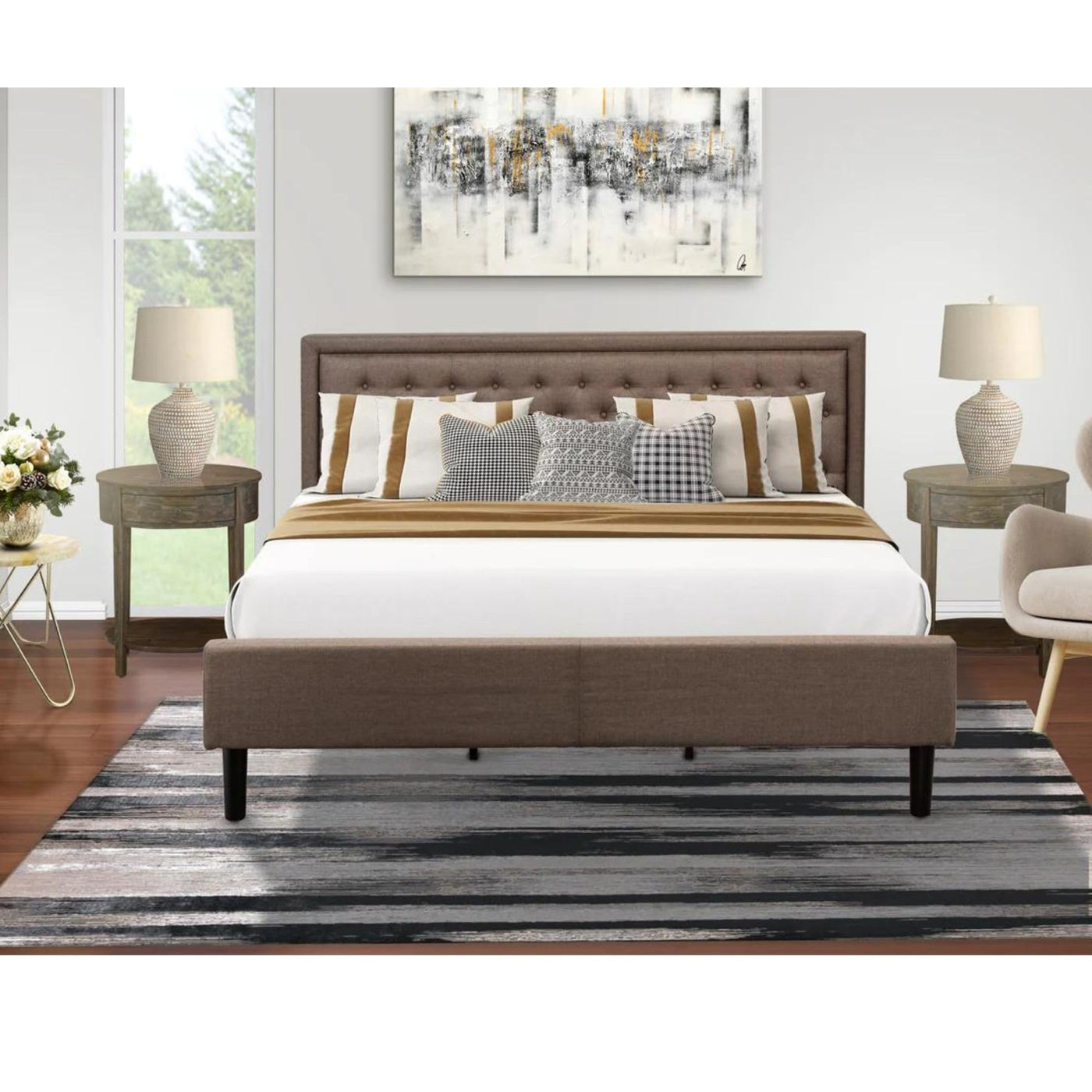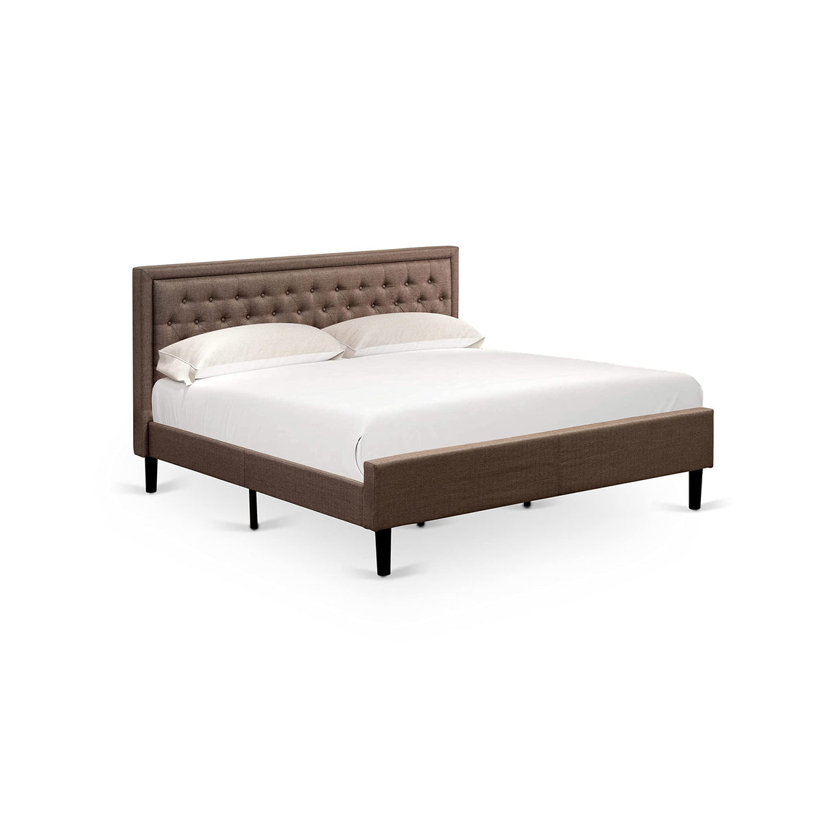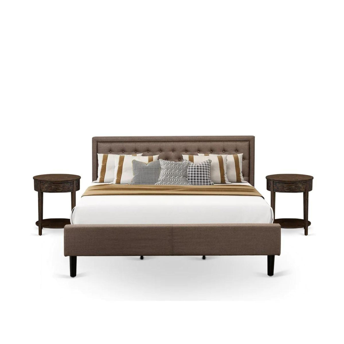 EAST WEST FURNITURE - KD18K-2HI07 - 3 PIECE BED SETThis exquisite bedroom set is a stunning addition to any bedroom in your home. Our 3 Piece king bed set includes a king platform bed and two small nightstands with one drawer each. It is guaranteed to impress any guests as it seamlessly blends with any type of decor. Engineered wood has been skillfully utilized in constructing both the king platform bed and mid-century modern nightstands, ensuring sturdy support for you and your mattress. The versatile bed features a robust wood headboard that serves as the focal point of your bedroom, providing a comfortable place to lean on and unwind. It is adorned with foam padding and covered in Brown Linen Fabric. This king bedroom set requires minimal maintenance and is a great choice for those on a budget. The package includes step-by-step assembly instructions for the headboard, footboard, wooden slats, and other accessories, enabling you to assemble them quickly. The Linen Fabric headboard is easy to clean and always enhances the overall appeal. With our product, your room will be enhanced and you'll experience a heightened sense of well-being.PRODUCT FEATURES: Material: Engineered Wood Bed Frame Color: Brown Bed Frame Legs Color: Black Night Stand Color: Distressed Jacobean Dimensions of King Size Bed Frame: Length: 89; Width: 81; Height: 47. Nightstand Dimensions: Length: 23.7; Width: 23.7; Height: 28.Include in this Package: 1 King Bed Frame and 2 Wood Night StandNote: Mattress is not included with this Wood Bed Frame.