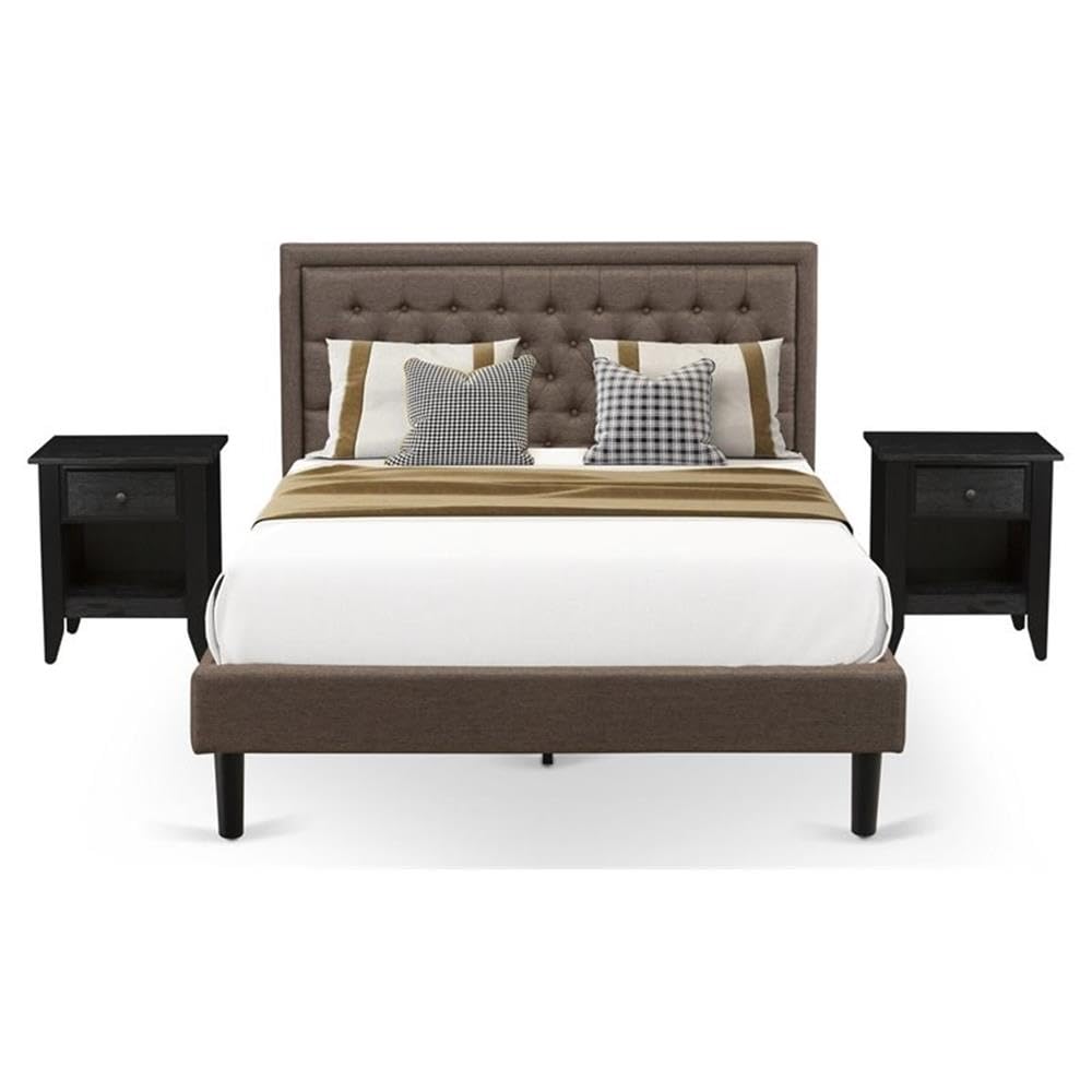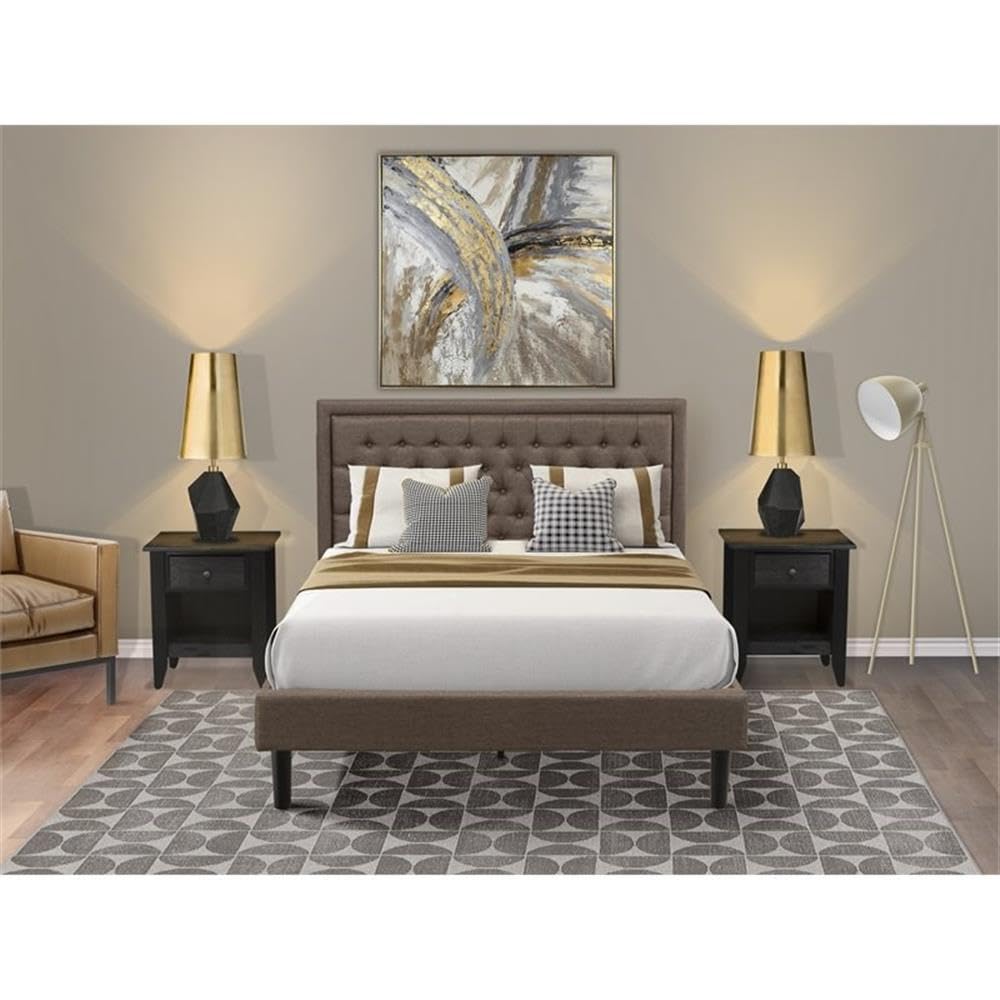 EAST WEST FURNITURE - KD18Q-2GA06 - 3 PC QUEEN BED SETEnhance the ambiance of any bedroom in your home with this exquisite queen size bed set. Comprising a 3-piece ensemble, it includes a sturdy wooden bed frame and two nightstands, each featuring a convenient drawer. The versatility of our queen bed set ensures it harmonizes effortlessly with any style of decor, impressing all who enter your home. We have meticulously crafted the queen size platform bed frame and compact Wire Brushed Black nightstands using engineered wood to provide robust support for both you and your mattress. The bed's standout feature is its beautifully designed wooden headboard, which serves as a focal point and a cozy spot for relaxation, thanks to its foam padding and elegant Brown Linen Fabric covering. Not only is this bed set low maintenance, but it is also remarkably budget-friendly. Inside the package, you will find detailed assembly instructions for the headboard, footboard, wooden slats, and other accessories, allowing you to effortlessly put them together in no time. Additionally, our Linen Fabric headboard is easy to clean, ensuring its appeal remains flawless.QUEEN BED SET FEATURES: Material: Engineered Wood Queen Size Bed Frame Color: Brown Queen Platform Bed Legs Color: Black Night Stands For Bedroom Top Color: Wire Brushed Black Wooden Nightstand Legs Color: Wire Brushed Black Dimensions of Queen Platform Bed: Length: 89; Width: 65; Height: 47. Mid Century Nightstand Dimensions: Length: 21; Width: 18; Height: 24.Include in this Package: 1 Queen Size Bed Frame and 2 Wooden NightstandNote: Mattress is not included with this Queen Platform Bed.