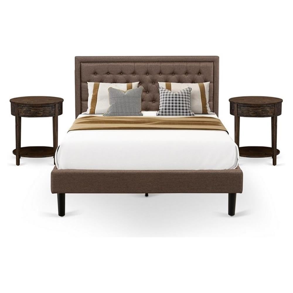 East West Furniture KD18Q-2HI07 3 Piece Bedroom Set - 1 Queen Size Platform Bed Brown Linen Fabric Padded and Button Tufted Headboard with 2 Wooden Night Stand - Distressed Jacobean Finish Nightstand