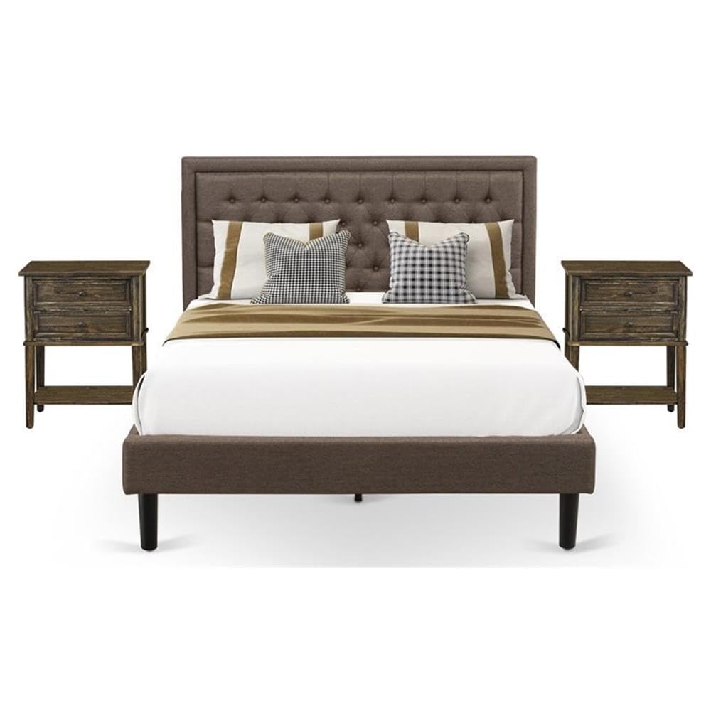 EAST WEST FURNITURE - KD18Q-2VL07 - 3 PIECE QUEEN SIZE BED SETEnhance the elegance of your bedroom with this exquisite bed set, which is a perfect addition to any home. Our 3 Piece bedroom set comprises of a platform bed and two mid-century nightstands, each equipped with two drawers. Its versatility allows it to seamlessly blend with any type of decor, leaving a lasting impression on anyone who visits your house. In our modern collection, the bed frame showcases an elegant brown linen fabric complemented by sleek black wooden legs. The accompanying nightstand exudes a rustic charm with its distressed Jacobean finish wood, creating a delightful contrast. The bed features a captivating wooden headboard, expertly crafted from durable wood, serving as the centerpiece of your bedroom and providing a comfortable spot to lean on and unwind.This bedroom set is not only aesthetically pleasing but also requires minimal maintenance, making it a budget-friendly choice The package includes step-by-step assembly instructions for the headboard, footboard, wood slats, and other accessories, enabling you to assemble them quickly and effortlessly. Our Linen Fabric headboard is easy to clean and consistently maintains its appealing appearance.QUEEN BED SET FEATURES: Material: Engineered Wood Bed Frame Color: Brown Platform Queen Bed Frame Legs Color: Black Mid Century Modern Nightstand Top Color: Distressed Jacobean Night Stands for Bedrooms Legs Color: Distressed Jacobean Dimensions of Queen Size Bed: Length: 89; Width: 65; Height: 47. Wooden Night Stand Dimensions: Length: 22; Width: 15.7; Height: 28.Include in this Package: 1 Queen Bed and 2 Mid Century NightstandNote: Mattress is not included with this Modern Bed Frame.