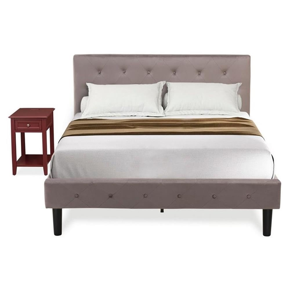 East West Furniture NL14F-1DE13 2 Piece Bed Set - Full Size Button Tufted Bed Frame - Brown Taupe Velvet Fabric Upholstered Headboard and a Burgundy Finish Nightstand