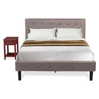 EAST WEST FURNITURE - NL14F-1DE13 - 2 PC BED SETRevamp your bedroom with this 2-Piece full bedroom set, featuring a platform bed frame with a Velvet upholstered headboard and a wooden nightstand. The bed's Black finish and Brown Taupe Velvet Color exude elegance, while the Burgundy-hued nightstand adds a striking touch. Crafted from top-notch Engineered wood, it ensures durability and regal appearance. The set effortlessly complements any bedroom decor. Constructed with sturdy wood, the set includes a bed frame and a nightstand with 02 USB fast charging ports and two outlets for your convenience. Enhance your bedroom with this quality, versatile, and budget-friendly furniture. Easily assemble the full-size platform bed using the provided instructions and hardware pack.FULL SIZE BED SET FEATURES: Material: Engineered Wood Platform Bed Frame Fabric: Velvet Platform Bed Fabric Color: Brown Taupe Full Size Bed Frame Legs Color: Black Night Stand Top Color: Burgundy Wooden Night Stand Legs Color: Burgundy Dimensions of Bed: Length: 84; Width: 59; Height: 41.30. Night Stand Dimensions: Length: 23.70; Width: 15.70; Height: 24.Include in this Package: 1 Bed Frame and 1 Night StandNote: Mattress is not included with this Full Size Bed.