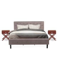 East West Furniture NL14K-2HA13 3 Piece Modern Bedroom Set - King Size Button Tufted Bed Frame - Brown Taupe Velvet Fabric Upholstered Headboard and a Burgundy Finish Nightstand