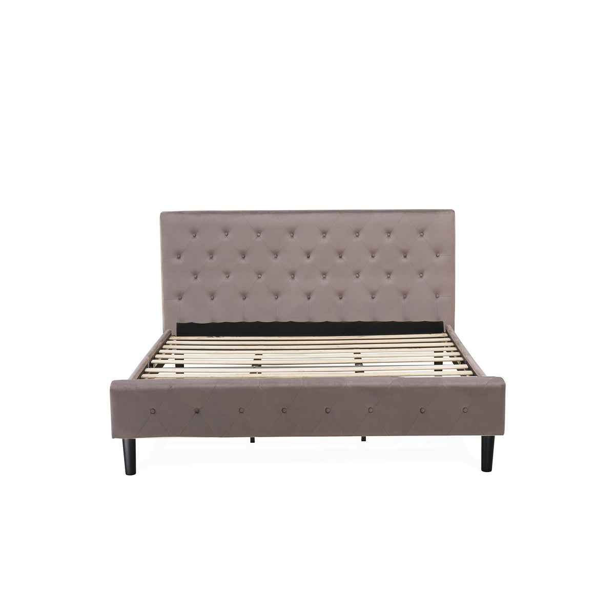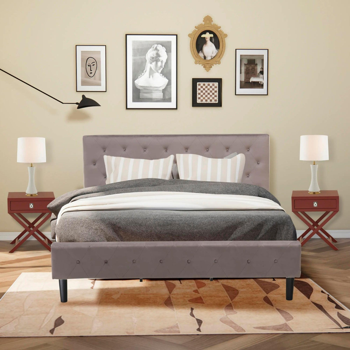 EAST WEST FURNITURE - NL14K-2HA13 - 3 PC BEDROOM SETEnhance the allure of your bedroom with a touch of timeless and breathtaking elegance through this exquisite 3-Piece bed set. The set includes a platform bed with a luxurious Velvet upholstered headboard and 2 wooden nightstands. The wooden bed frame is beautifully finished in Black, while the Velvet Color boasts a warm Brown Taupe, and the nightstands feature a captivating Burgundy hue. Crafted from durable wood, this bed set comes in a king size, providing the perfect centerpiece to adorn any bedroom. Meticulously designed with great attention to detail, we have utilized high-quality Engineered wood material to ensure both quality and versatility in this exquisite bedroom set. Not only does this king bed set elevate the aesthetics of your bedroom, but it also offers practicality and convenience, making it a wise and budget-friendly choice. Assembling the king bed frame is a breeze, thanks to the provided step-by-step assembly instructions and hardware pack, and its low maintenance feature ensures long-lasting enjoyment.KING SIZE BEDROOM SET FEATURES: Material: Engineered Wood King Size Bed Fabric: Velvet King Size Platform Bed Frame Fabric Color: Brown Taupe King Size Platform Bed Frame Legs Color: Black Night Stands Top Color: Burgundy Small Night Stand Legs Color: Burgundy Dimensions of Bed: Length: 89; Width: 81; Height: 47. Night Stand Dimensions: Length: 19.7; Width: 15.7; Height: 23.6.Include in this Package: 1 King Bed Frame and 2 Bedroom NightstandsNote: Mattress is not included with this Modern Bed Frame.