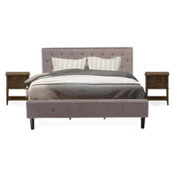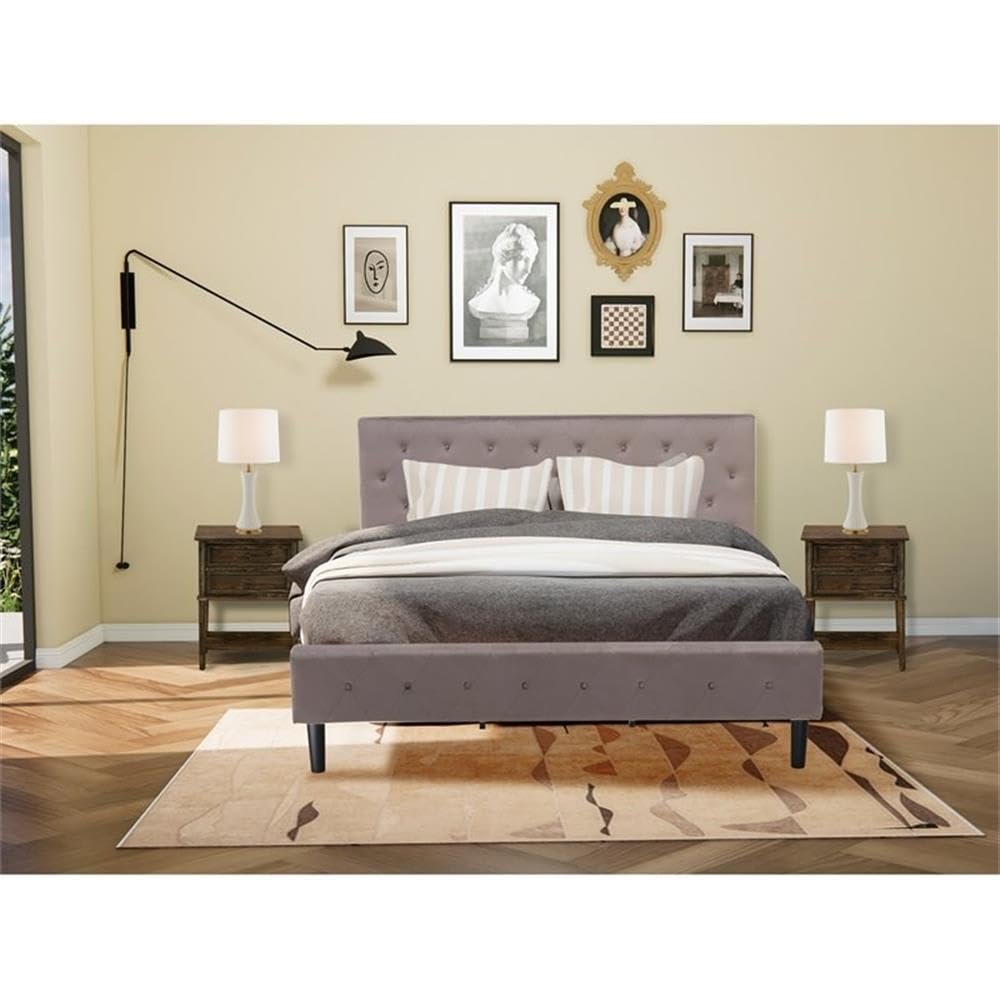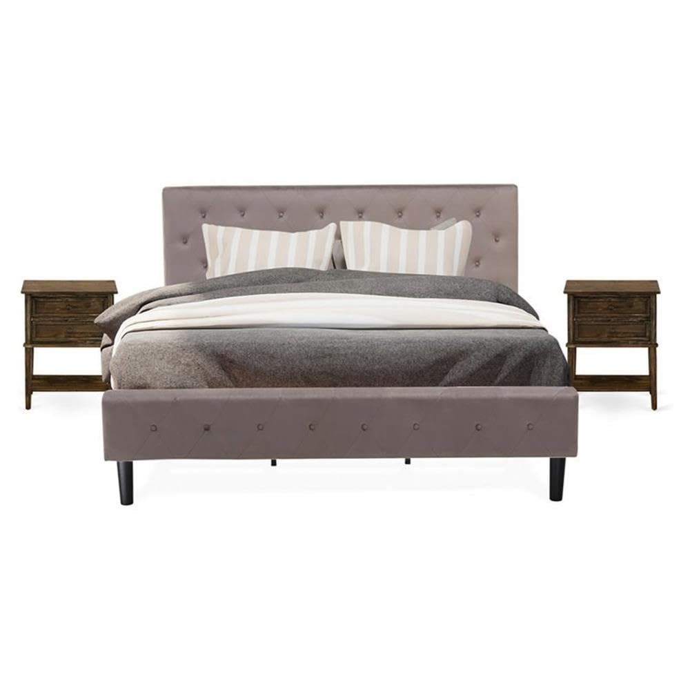 EAST WEST FURNITURE - NL14K-2VL07 - 3 PC KING SIZE BEDROOM SETTransform your bedroom with a touch of traditional and elegant beauty using this 3-Piece bed set. This king bedroom set includes a king platform bed with a Velvet upholstered headboard and 2 wood nightstands. The king bed frame boasts a Black finish and a Brown Taupe Velvet Color headboard, while the mid century modern nightstand features a charming Distressed Jacobean color. Exemplifying our commitment to unparalleled craftsmanship, we have meticulously manufactured this wooden bedroom set using top-quality Engineered wood material. Constructed with sturdy wooden, this king size bed set contains king size platform bed frame and a wooden night stand to decor any bedroom. This king size bed set is sure to enhance any bedroom with quality, versatility, and convenience. This king bed set is low maintenance furniture and it is a good choice because of how budget-friendly it is. This king size bed frame can be easily assembled with the provided step-by-step assembly instruction and hardware pack.WOOD BEDROOM SET FEATURES: Material: Engineered Wood Platform Bed Fabric: Velvet Wooden Bed Frame Fabric Color: Brown Taupe Platform Bed Frame Legs Color: Black Mid Century Modern Nightstand Top Color: Distressed Jacobean Wooden Night Stand Legs Color: Distressed Jacobean Dimensions of Bed: Length: 89; Width: 81; Height: 47. Night Stand Dimensions: Length: 22; Width: 15.7; Height: 28.Include in this Package: 1 Platform Bed Frame and 2 Small Night StandsNote: Mattress is not included with this Wooden Bed Frame.