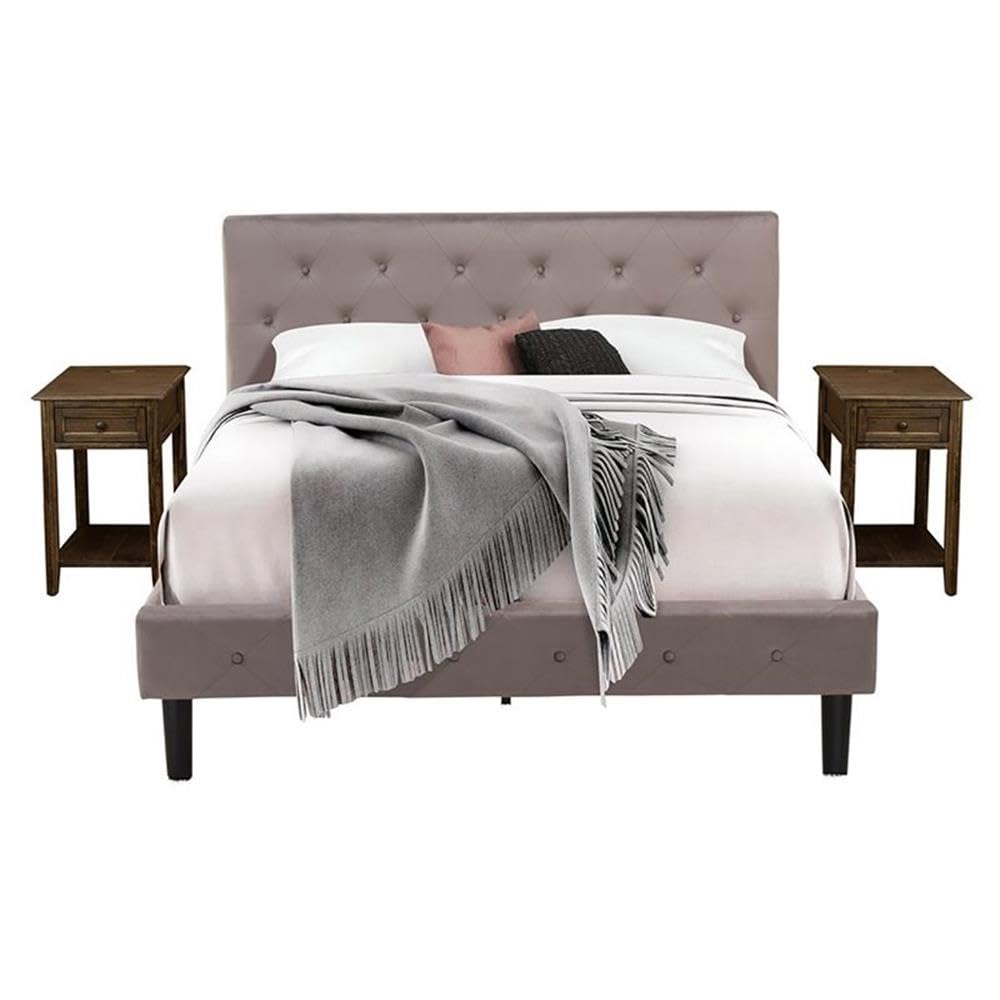 East West Furniture NL14Q-2DE07 3 Pc Bed Set - 1 Wood Bed Brown Taupe Velvet Fabric Headboard and 2 Nightstand - Distressed Jacobean Finish Nightstand