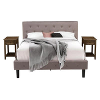 EAST WEST FURNITURE - NL14Q-2DE07 - 3 PIECE BED SETElevate your bedroom's elegance with this 3-Piece queen bed set, blending tradition and style. The set includes a queen size bed with a Velvet upholstered headboard, a wood frame, and 2 small nightstands. Its sleek Black finish and rich Brown Taupe headboard bring a touch of class, complemented by charming Distressed Jacobean nightstands. Crafted meticulously from top-quality Engineered wood, this queen bed set showcases exceptional craftsmanship and durability. The set comprises a sturdy wooden platform queen bed frame and a nightstand, ideal for any bedroom decor. The nightstand features two USB fast charging ports and two outlets for added convenience. Infuse your bedroom with antique glamour through this gorgeous bed set, designed for both quality and versatility. Budget-friendly and low maintenance, it is the perfect choice for upgrading your space. Assembling the queen size platform bed frame is simple with the provided step-by-step instructions and hardware pack.QUEEN BEDROOM SET FEATURES: Material: Engineered Wood Queen Size Platform Bed Frame Fabric: Velvet Queen Platform Bed Fabric Color: Brown Taupe Queen Bed Frame Legs Color: Black Nightstand Bedroom Top Color: Distressed Jacobean Night Stands For Bedrooms Legs Color: Distressed Jacobean Dimensions of Bed: Length: 89; Width: 65; Height: 41.30. Night Stand Dimensions: Length: 23.7; Width: 15.7; Height: 24.Include in this Package: 1 Queen Size Platform Bed Frame and 2 Small Nightstands.Note: Mattress is not included with this Queen Size Bed.