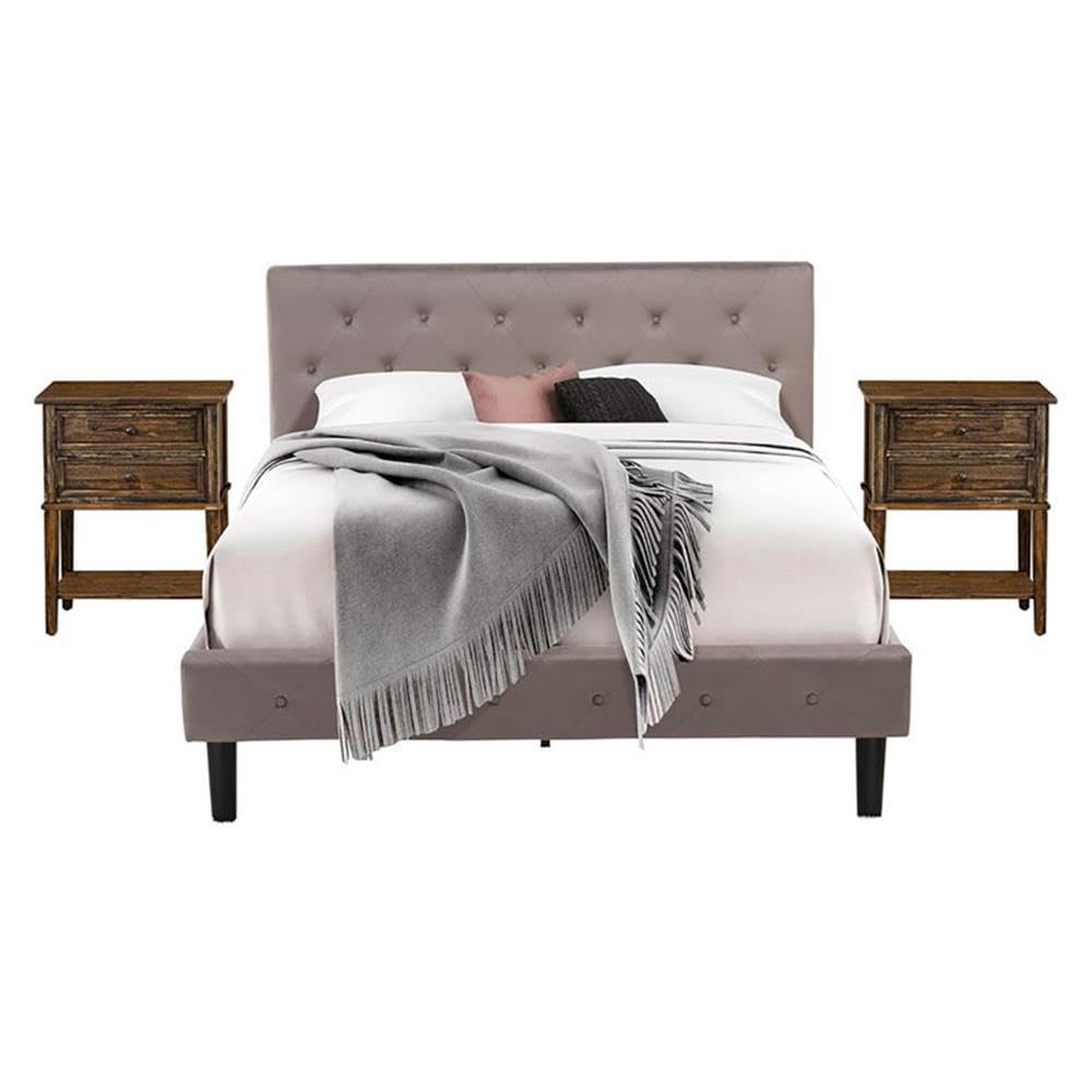 East West Furniture NL14Q-2VL07 3 Pc Bed Set - Queen Size Button Tufted Bed - Brown Taupe Velvet Fabric Upholstered Headboard and a Distressed Jacobean Finish Nightstand