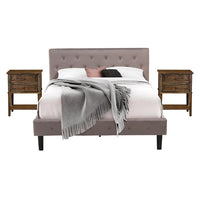 EAST WEST FURNITURE - NL14Q-2VL07 - 3 PC BEDROOM SETCreate an elegantly traditional bedroom space with this 3-Piece queen-size bedroom set. The set includes a queen bed frame with a Velvet upholstered headboard and 2 wooden nightstands. The platform bed comes in a sleek Black finish with a luxurious Brown Taupe Velvet headboard, while the bedroom nightstand features a Distressed Jacobean color. Crafted with superior craftsmanship using top-quality Engineered wood material. Add traditional glamour to your bedroom with this queen bedroom set. It comes with a platform queen bed frame and nightstands for easy bedroom decor. Enhance any bedroom with quality, versatility, and budget-friendly convenience. The bed frame is easy to assemble with provided instructions and hardware.BED SET FEATURES: Material: Engineered Wood Queen Size Bed Fabric: Velvet Bed frame Fabric Color: Brown Taupe Wooden Bed Frame Legs Color: Black Wood Night Stand Top Color: Distressed Jacobean Night Stand Legs Color: Distressed Jacobean Dimensions of Bed: Length: 89; Width: 65; Height: 41.30. Night Stand Dimensions: Length: 22; Width: 15.7; Height: 28.Include in this Package: 1 Queen Size Bed and 2 Night StandsNote: Mattress is not included with this Platform Bed.