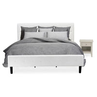 EAST WEST FURNITURE - NL19K-1GA0C - 2 PC WOODEN BEDROOM SETThis fabulous king bed set is a shining example of modern design and forward thinking. Add elements of antique glamour to your bedroom with this gorgeous king bedroom set. Manufactured with sturdy wood, this king bed set contains a wooden bed frame and a wood night stand to decor any bedroom. This king bed set is sure to enhance any bedroom with quality, versatility, and convenience. This king bed set is low maintenance furniture and it is a good choice because of how budget-friendly it is. This platform bed can be easily assembled with all the provided step-by-step assembly instructions and hardware packs.KING SIZE BEDROOM SET FEATURES: Material: Engineered Wood King Size Bed Fabric: Velvet Platform Bed Frame Fabric Color: White King Bed Frame Legs Color: Black Wooden Night Stand Top Color: Wire Brushed Butter Cream Modern Nightstand Legs Color: Wire Brushed Butter Cream Dimensions of Bed: Length: 89; Width: 81; Height: 47. Night Stand Dimensions: Length: 21; Width: 18; Height: 24.Include in this Package: 1 King Platform Bed Frame and 1 Night StandNote: Mattress is not included with this King Size Bed Frame.