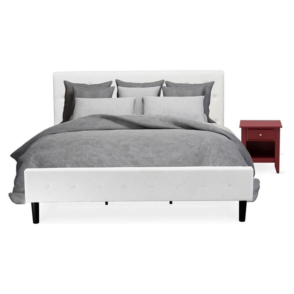 EAST WEST FURNITURE - NL19K-1GA13 - 2 PC BEDROOM SETThis gorgeous king bedroom set is a shining example of innovative style and forward thinking. Add elements of antique glamour to your bedroom with this gorgeous king size bed set. Crafted with durable wooden, this king bedroom set comes with king size bed frame and a nightstand bedroom to decor any bedroom. This king size bed set is sure to enhance any bedroom with quality, versatility, and convenience. This bedroom set is low maintenance furniture and it is a great choice because of how budget-friendly it is. This king platform bed can be easily assembled with the provided step-by-step assembly instruction and hardware pack.WOODEN BEDROOM SET FEATURES: Material: Engineered Wood King Bed Fabric: Velvet King Platform Bed Frame Fabric Color: White Modern Bed Frame Legs Color: Black Small Nightstand Top Color: Burgundy Modern Nightstand Legs Color: Burgundy Dimensions of Bed: Length: 89; Width: 81; Height: 47. Night Stand Dimensions: Length: 21; Width: 18; Height: 24.Include in this Package: 1 Wooden Bed Frame and 1 Night Stand for BedroomNote: Mattress is not included with this King Platform Bed.
