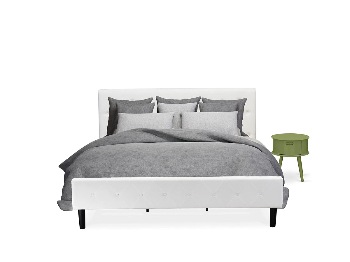 East West Furniture NL19K-1GO12 2 Piece King Bedroom Set - Button Tufted Platform Bed Frame - Linen white Velvet Fabric Upholstered Headboard and a Clover Green Finish Nightstand