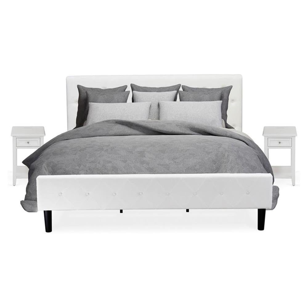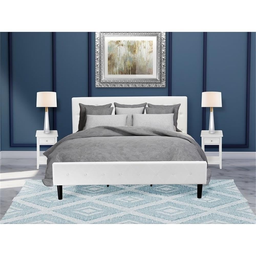 EAST WEST FURNITURE - NL19K-2DE05 - 3 PC BEDROOM SETThis gorgeous king bedroom set is a shining example of innovative style and forward thinking. Add elements of traditional glamour to your bedroom with this gorgeous bed set. Constructed with sturdy wooden, this king bed set includes king size platform bed frame and a bedroom nightstand to decor any bedroom. Our bedside table with 02 USB fast charging ports and two outlets allows you to charge your mobile phones and other devices. It will also help you to plug in your computer or laptop. This king bedroom set is sure to enhance any bedroom with quality, versatility, and convenience. This king bedroom set is low maintenance furniture and it is a great choice because of how budget-friendly it is. This king platform bed frame can be easily assembled with the provided step-by-step assembly instruction and hardware pack.BED SET FEATURES: Material: Engineered Wood King Platform Bed Frame Fabric: Velvet Wood Bed Frame Fabric Color: White Platform Bed Frame Legs Color: Black Small Night Stand Top Color: White Night Stands For Bedroom Legs Color: White Dimensions of Bed: Length: 89; Width: 81; Height: 47. Night Stand Dimensions: Length: 23.7; Width: 15.7; Height: 24.Include in this Package: 1 Platform Bed and 2 Modern Nightstands.Note: Mattress is not included with this Wood Bed Frame.