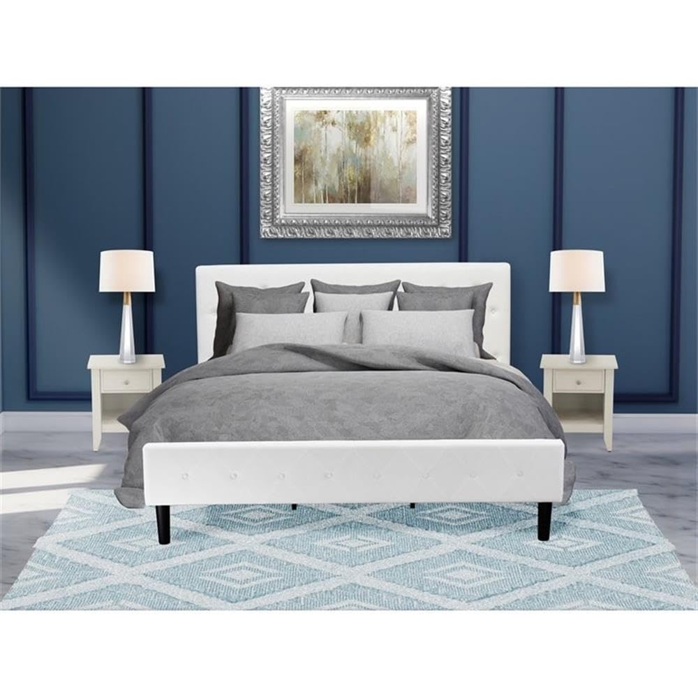 EAST WEST FURNITURE - NL19K-2GA0C - 3 PC KING SIZE BEDROOM SETThis attractive wood bedroom set is a shining example of innovative style and forward thinking. Add elements of classic glamour to your bedroom with this gorgeous bedroom set. Manufactured with durable wooden, this bedroom set comes with a king platform bed and night stands to decor any bedroom. This king bed set is sure to enhance any bedroom with quality, versatility, and convenience. This king bedroom set is low maintenance furniture and it is a good choice because of how budget-friendly it is. This modern bed frame can be simply assembled with all the provided step-by-step assembly instructions and hardware pack.KING SIZE BEDROOM SET FEATURES: Material: Engineered Wood King Size Platform Bed Frame Fabric: Velvet King Platform Bed Fabric Color: White King Bed Legs Color: Black Night Stands Top Color: Wire Brushed Butter Cream Night Stands Legs Color: Wire Brushed Butter Cream Dimensions of Bed: Length: 89; Width: 81; Height: 47. Night Stand Dimensions: Length: 21; Width: 18; Height: 24.Include in this Package: 1 King Size Bed and 2 Night StandNote: Mattress is not included with this Platform Bed.